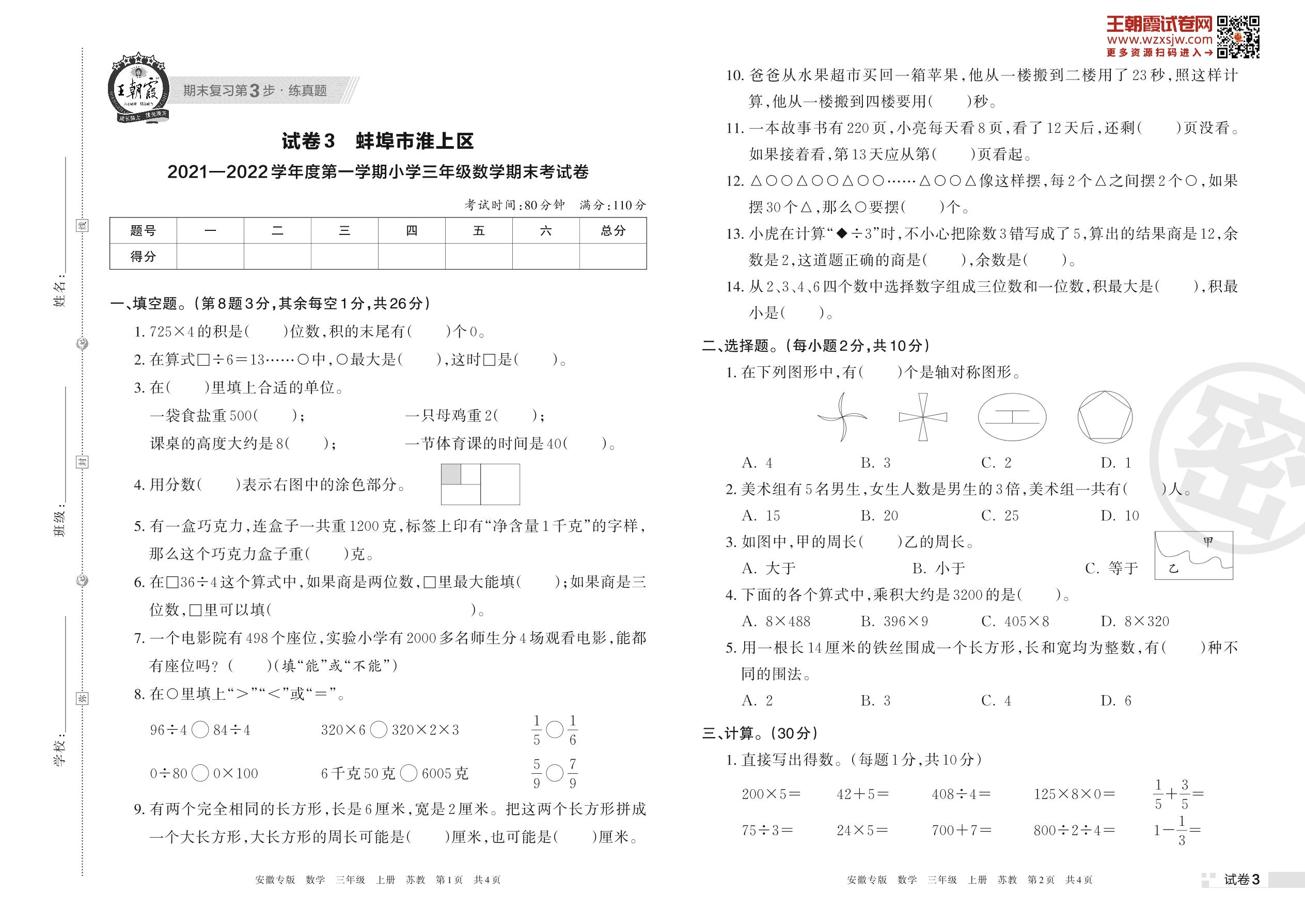 蚌埠市淮上区2021—2022学年度第一学期小学三年级数学期末考试卷(苏教版)【3】