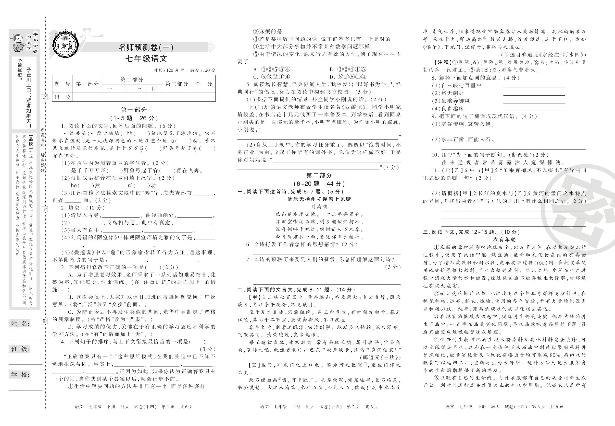 王朝霞名师期末预测卷七年级下册语文(河大版)【14】