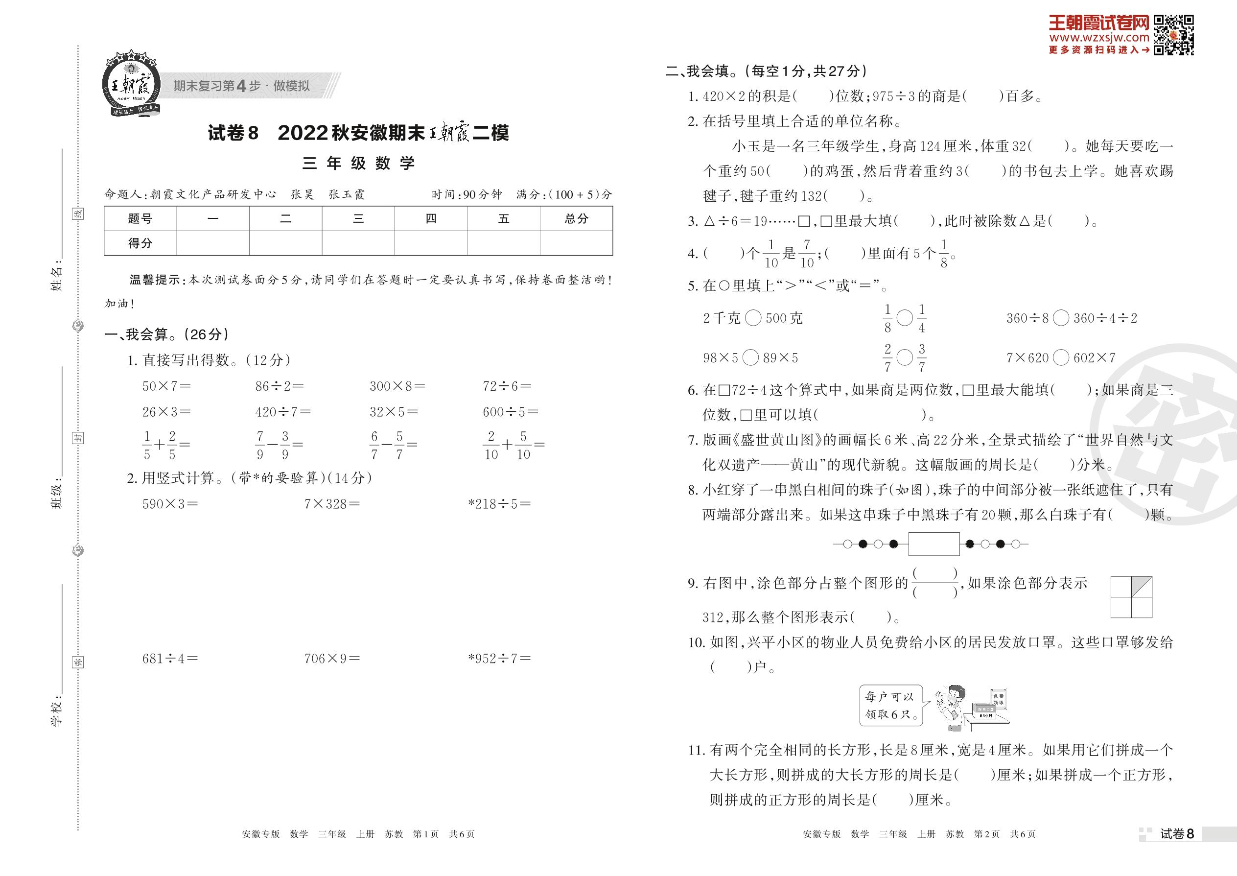 王朝霞期末模拟卷三年级上册数学(苏教版)_R221126205906215【8】
