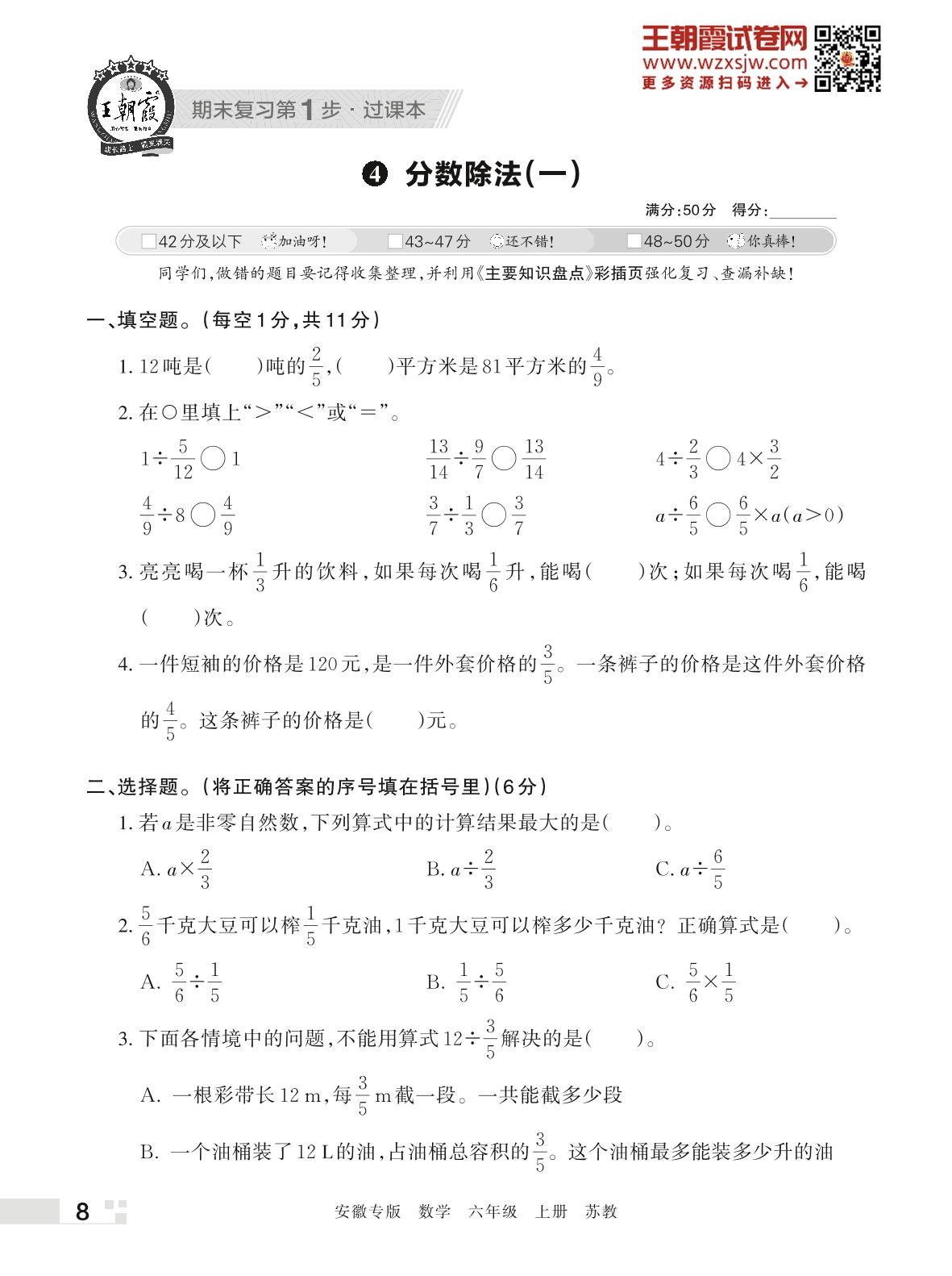 王朝霞期末过课本——4 分数除法(一)六年级上册数学(苏教版)_R221126211746110