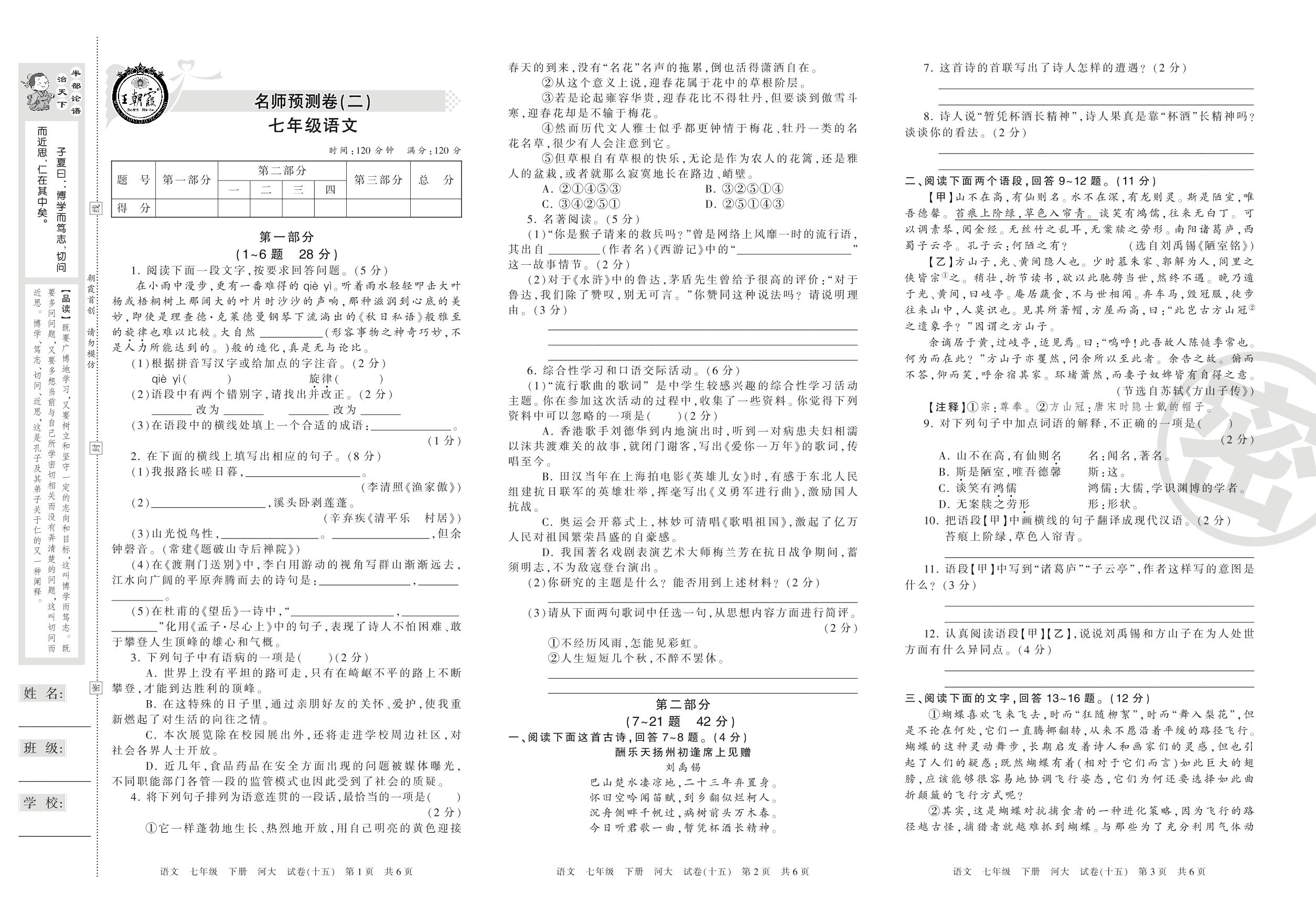 王朝霞名师期末预测卷七年级下册语文(河大版)【15】