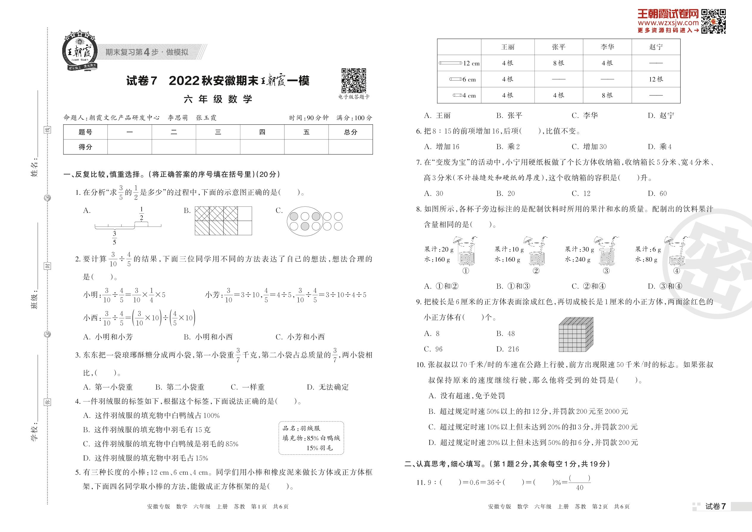王朝霞期末模拟卷六年级上册数学(苏教版)_R221126211748214【7】
