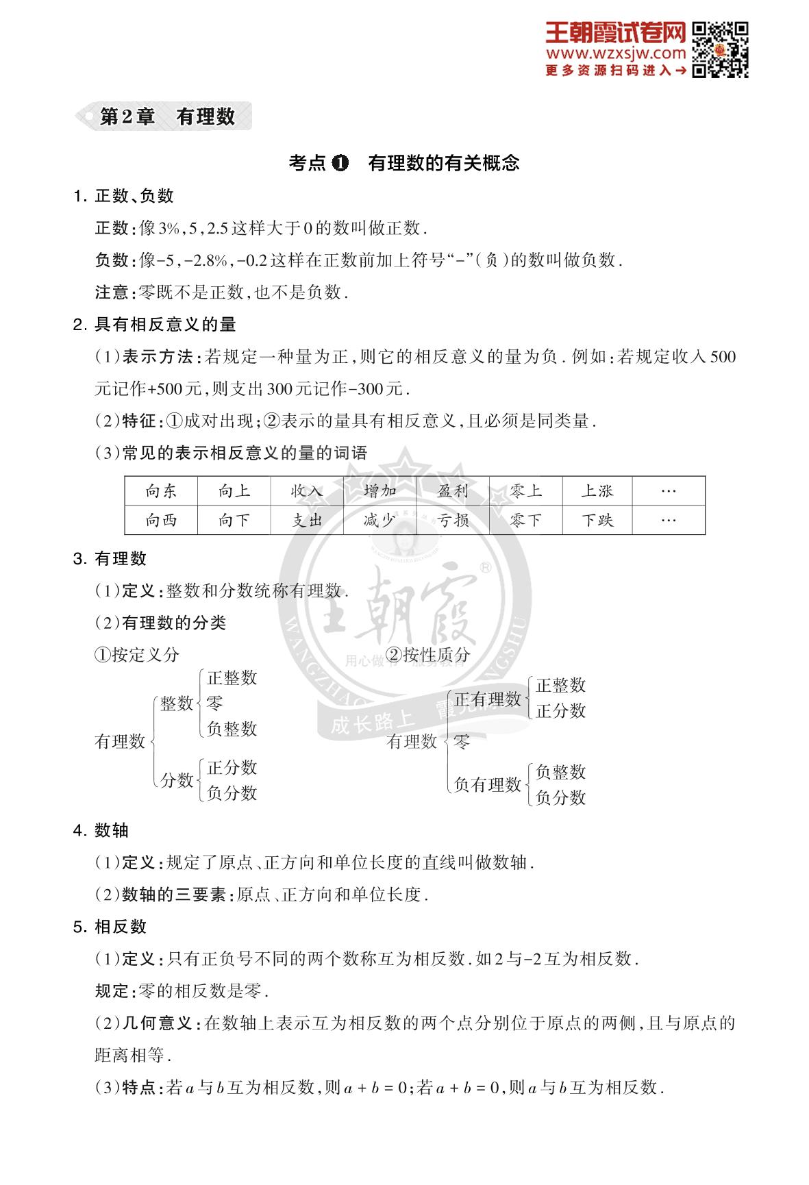 王朝霞期末过课本——第2章 有理数七年级上册数学(华师版)