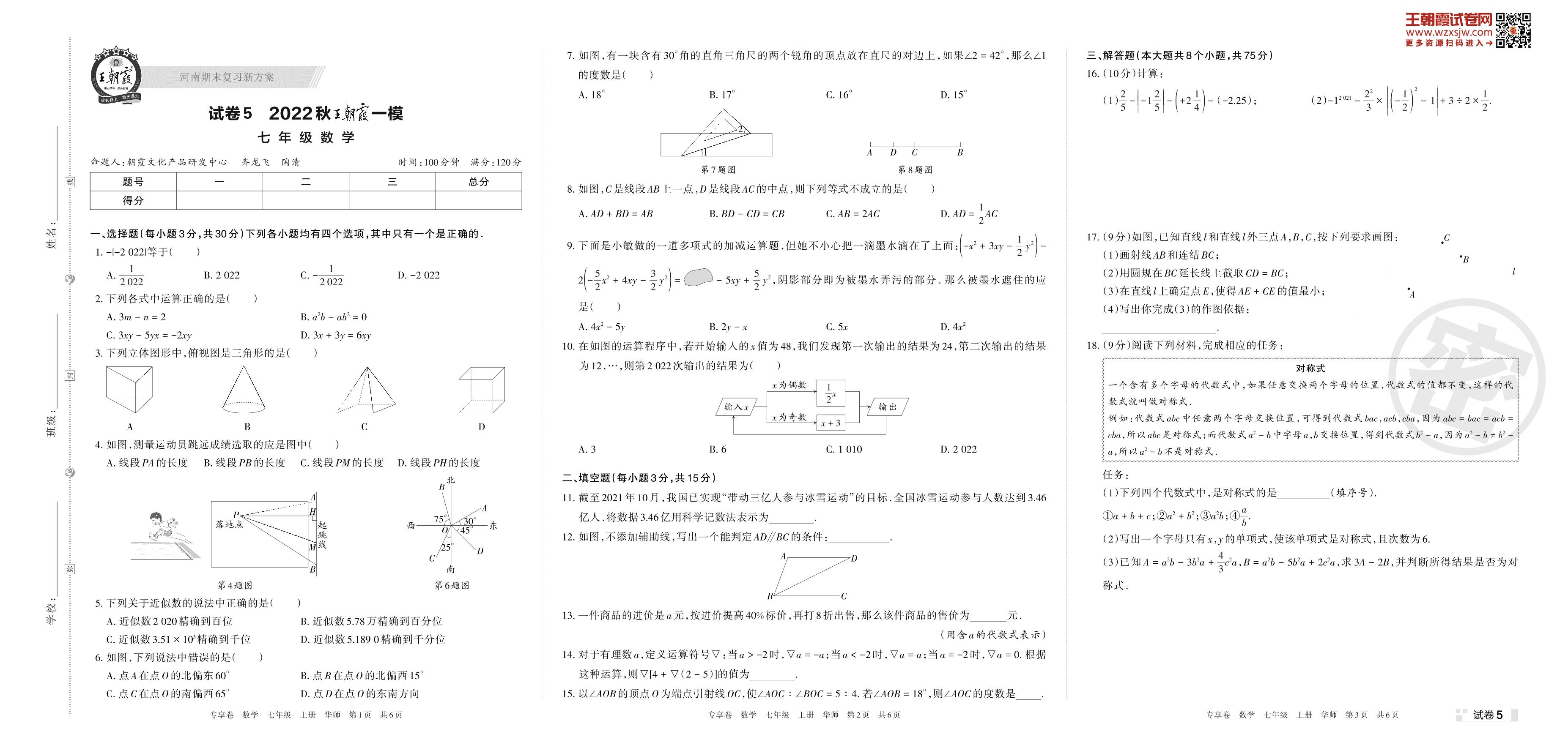 王朝霞期末模拟卷七年级上册数学(华师版)【5】