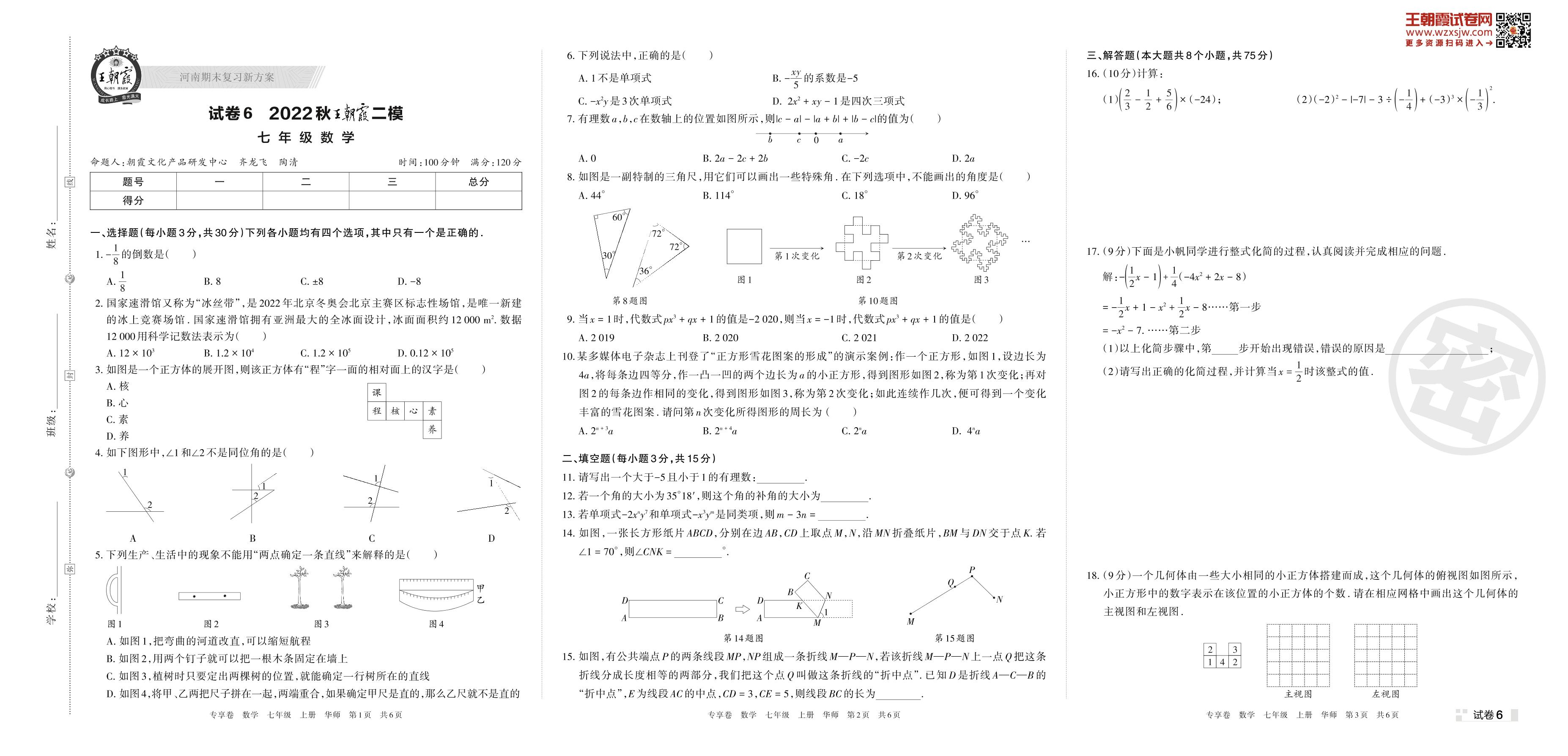 王朝霞期末模拟卷七年级上册数学(华师版)【6】