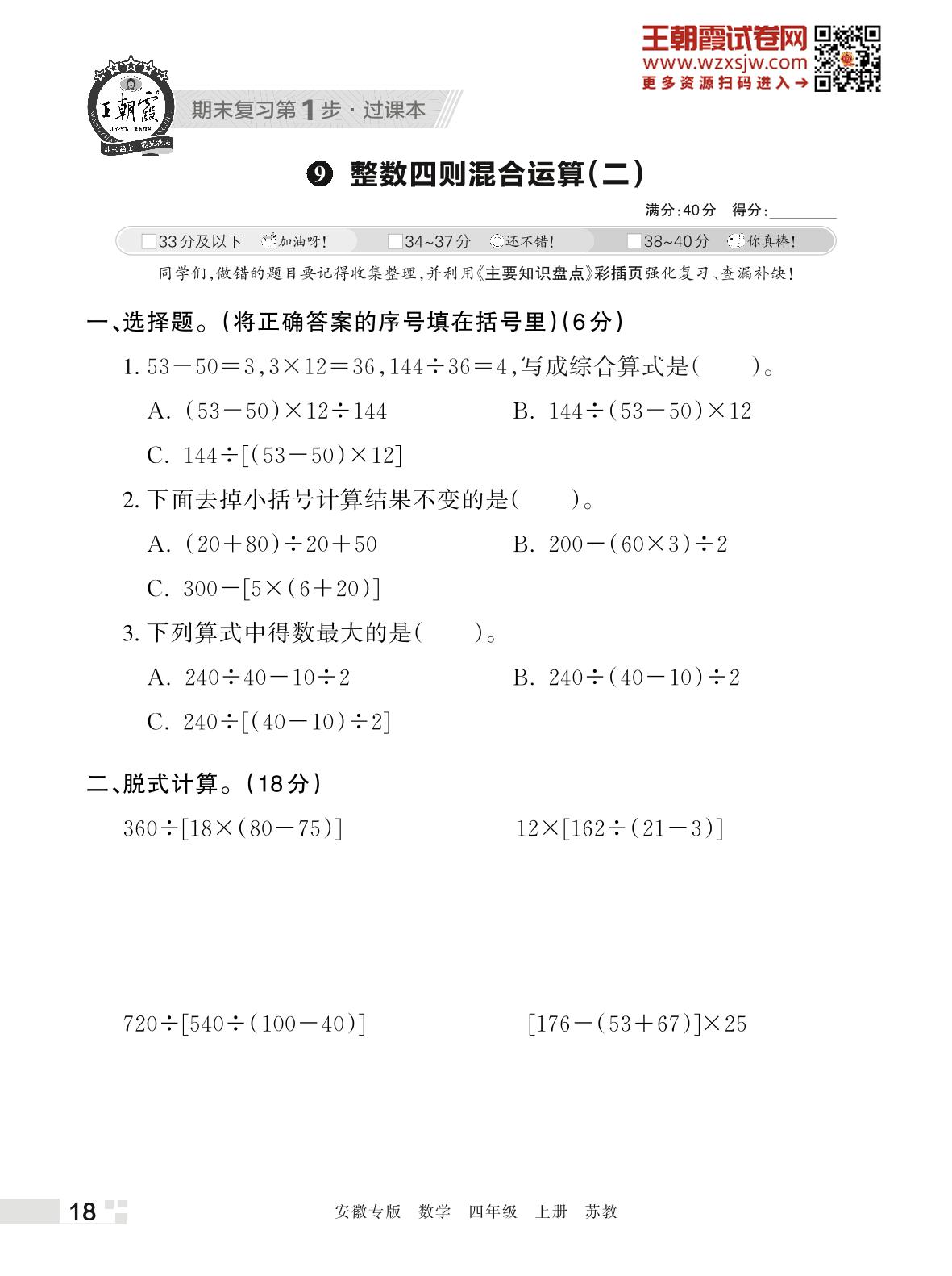 王朝霞期末过课本——9 整数四则混合运算(二)四年级上册数学(苏教版)_R221126212701234