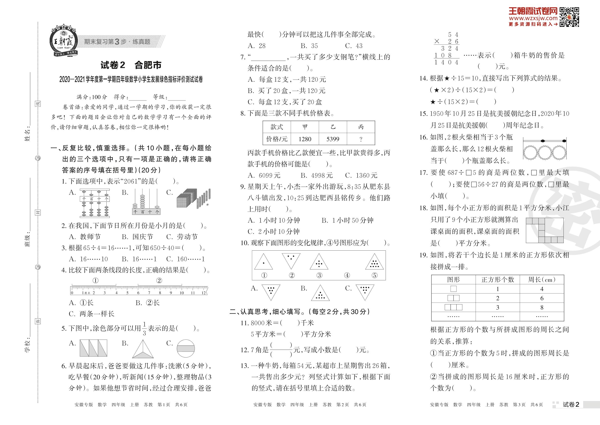 合肥市2020—2021学年度第一学期四年级数学小学生发展绿色指标评价测试试卷(苏教版)【2】