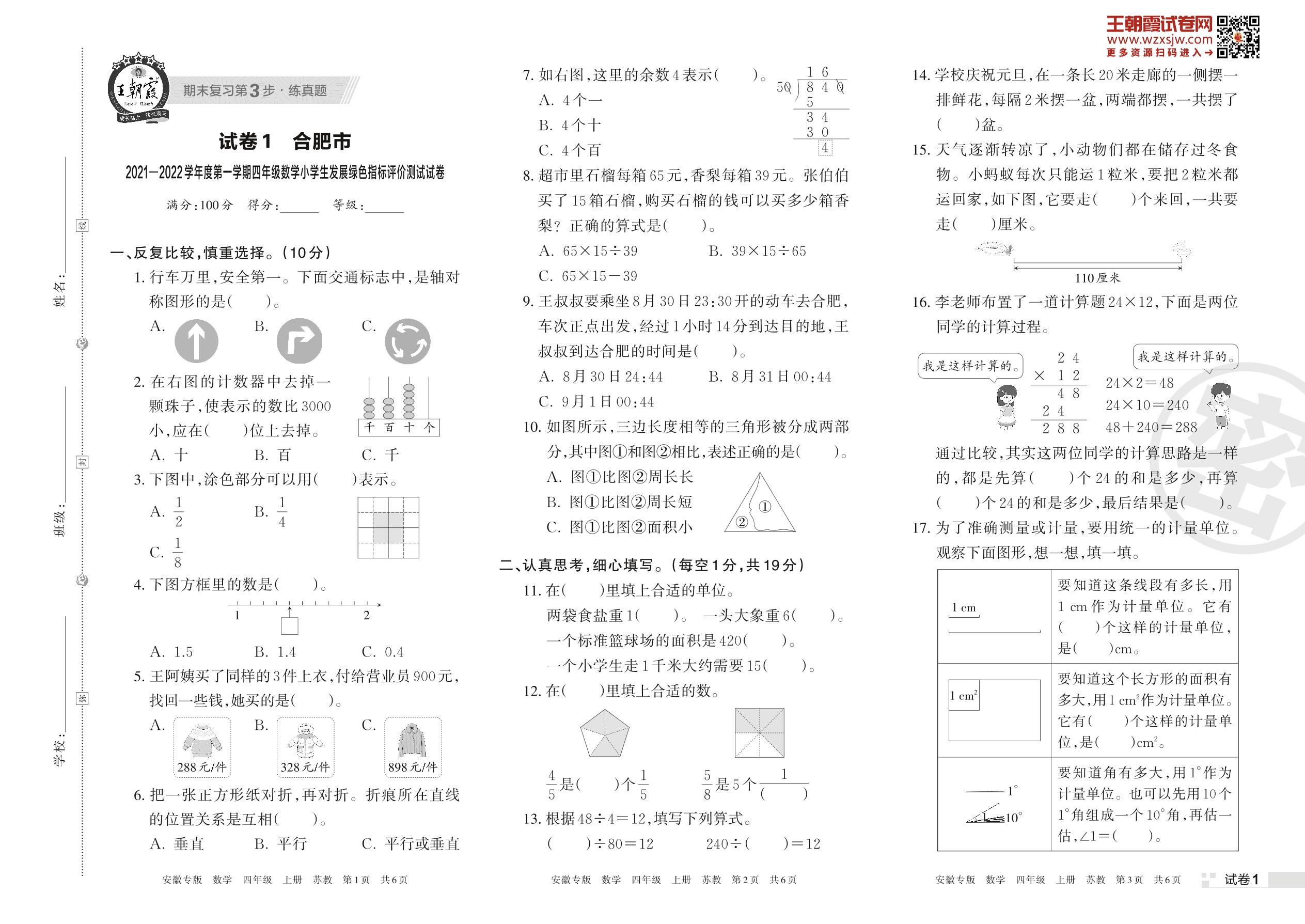 合肥市2021—2022学年度第一学期四年级数学小学生发展绿色指标评价测试试卷(苏教版)【1】