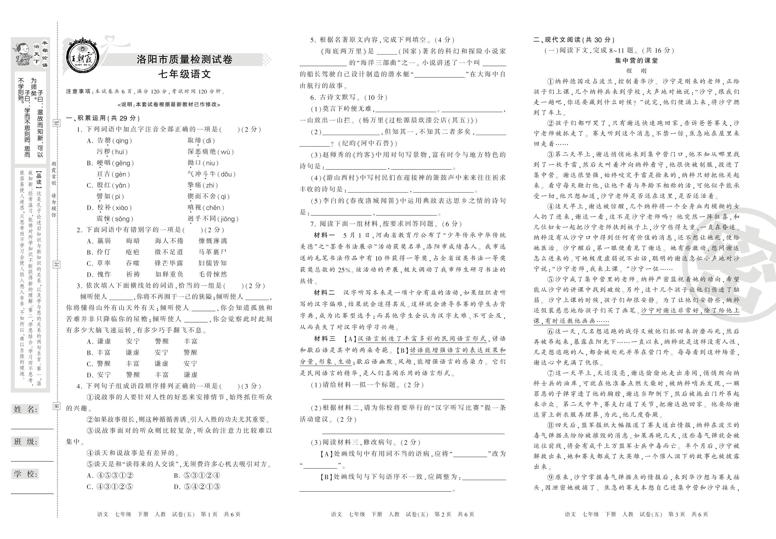 2015-2016学年第二学期洛阳市七年级语文试卷(人教版)_R210802135500【5】