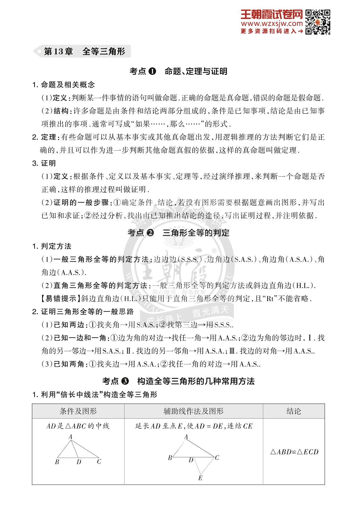 王朝霞期末过课本——第13章 全等三角形八年级上册数学(华师版)