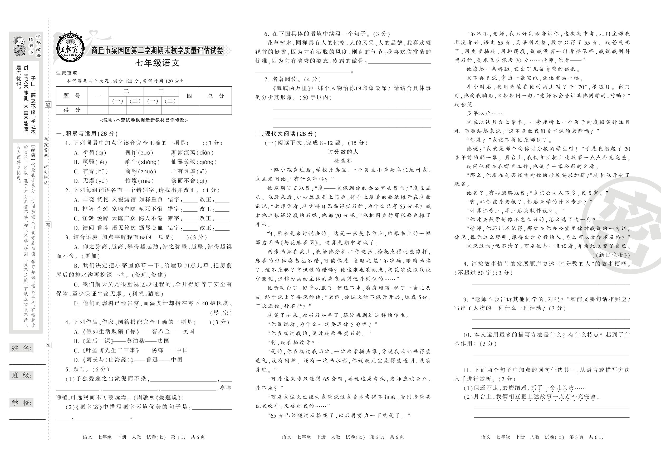 2015-2016学年第二学期商丘市梁园区七年级语文试卷(人教版)【7】