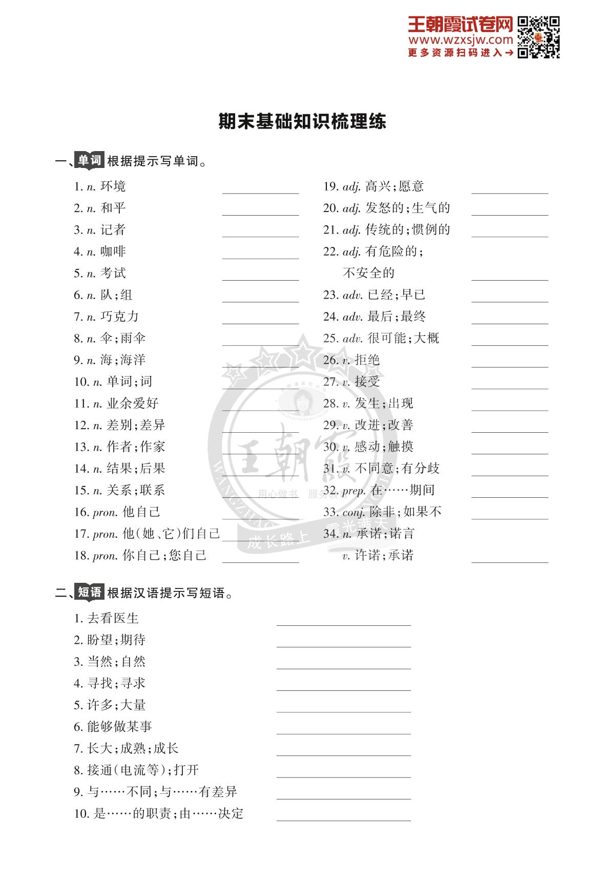 王朝霞期末过基础——期末基础知识梳理练八年级上册英语(人教版)