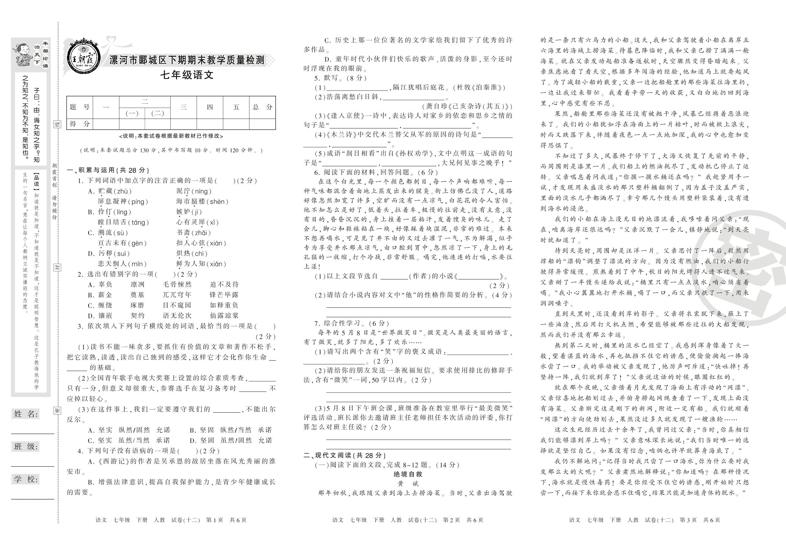 2015-2016学年第二学期漯河市郾城区七年级语文试卷(人教版)【12】