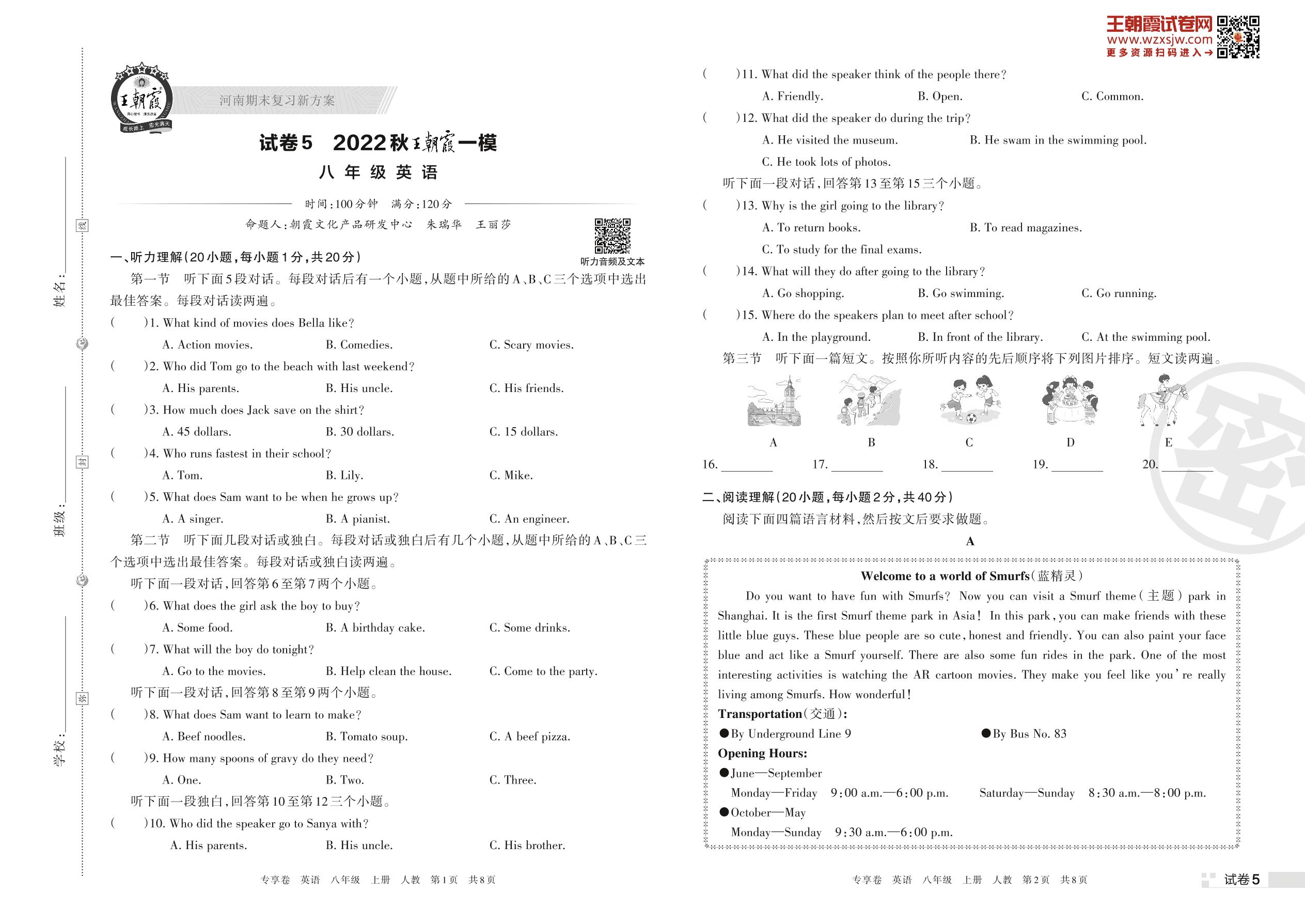 王朝霞期末模拟卷八年级上册英语(人教版)【5】