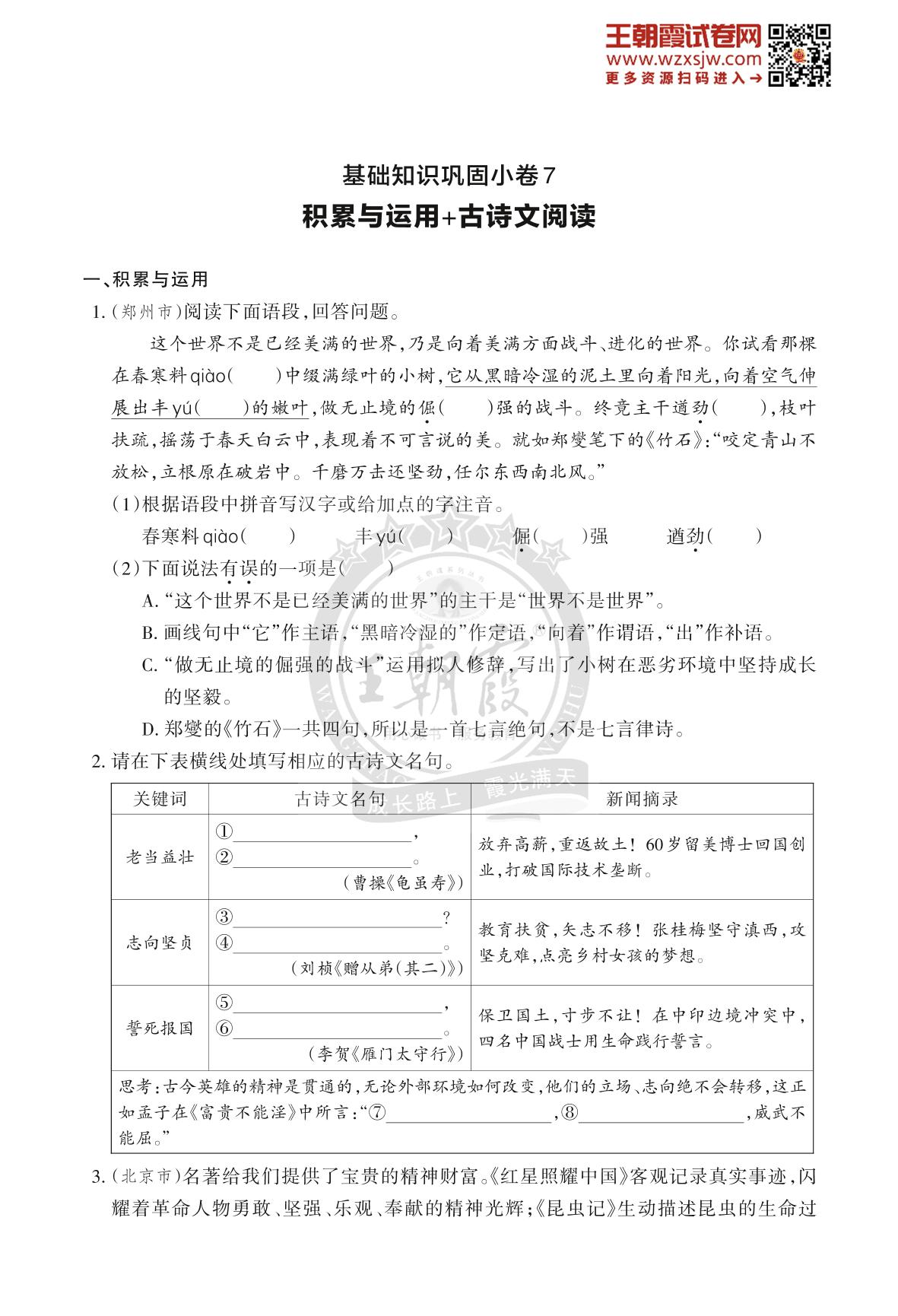 王朝霞期末过基础——基础知识巩固小卷7八年级上册语文(人教版)