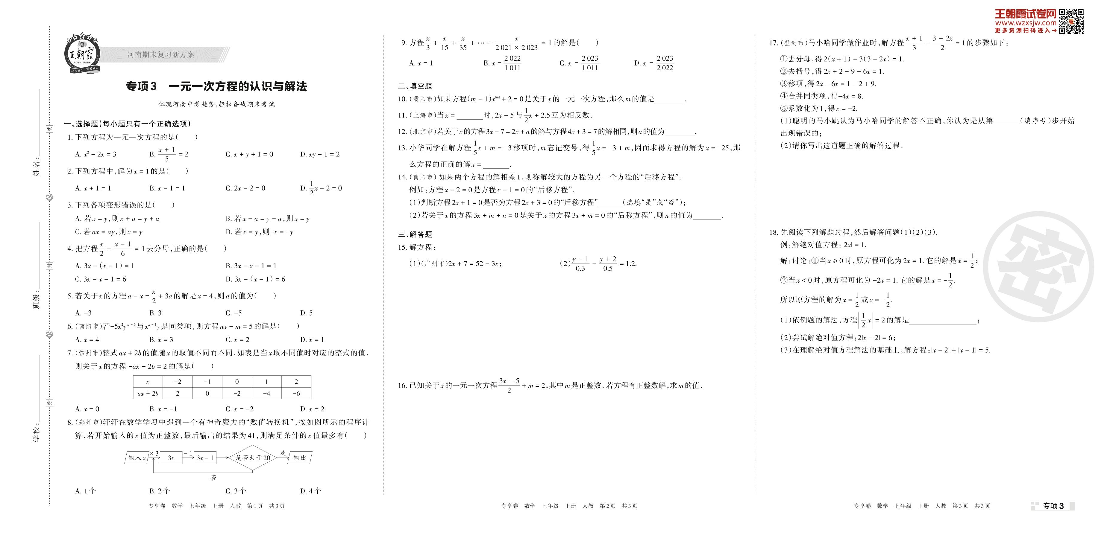 王朝霞期末专项卷——一元一次方程的认识与解法七年级上册数学(人教版)【3】