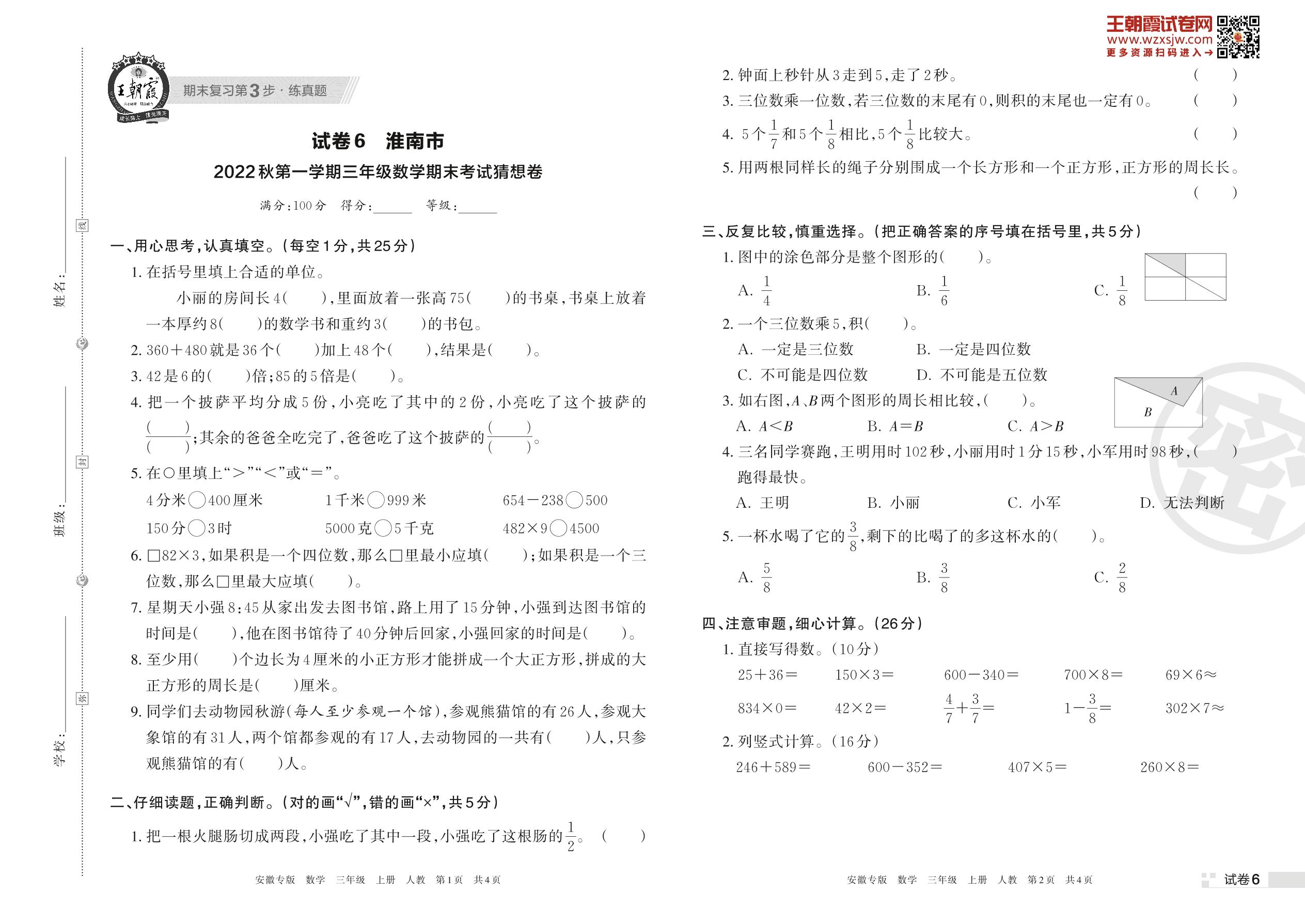 淮南市2022秋第一学期三年级数学期末考试猜想卷(人教版)【6】