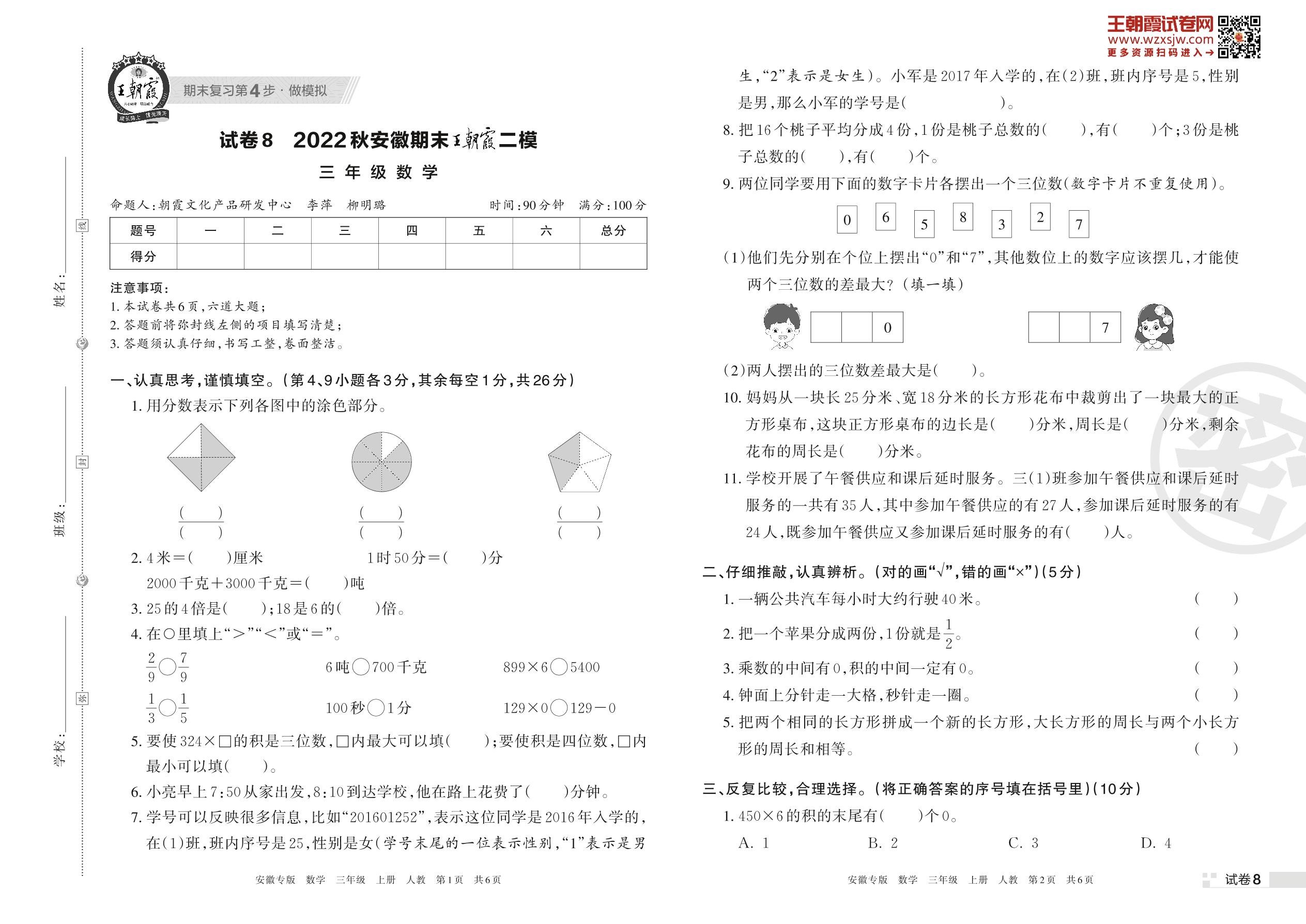 王朝霞期末模拟卷三年级上册数学(人教版)_R221127112910547【8】