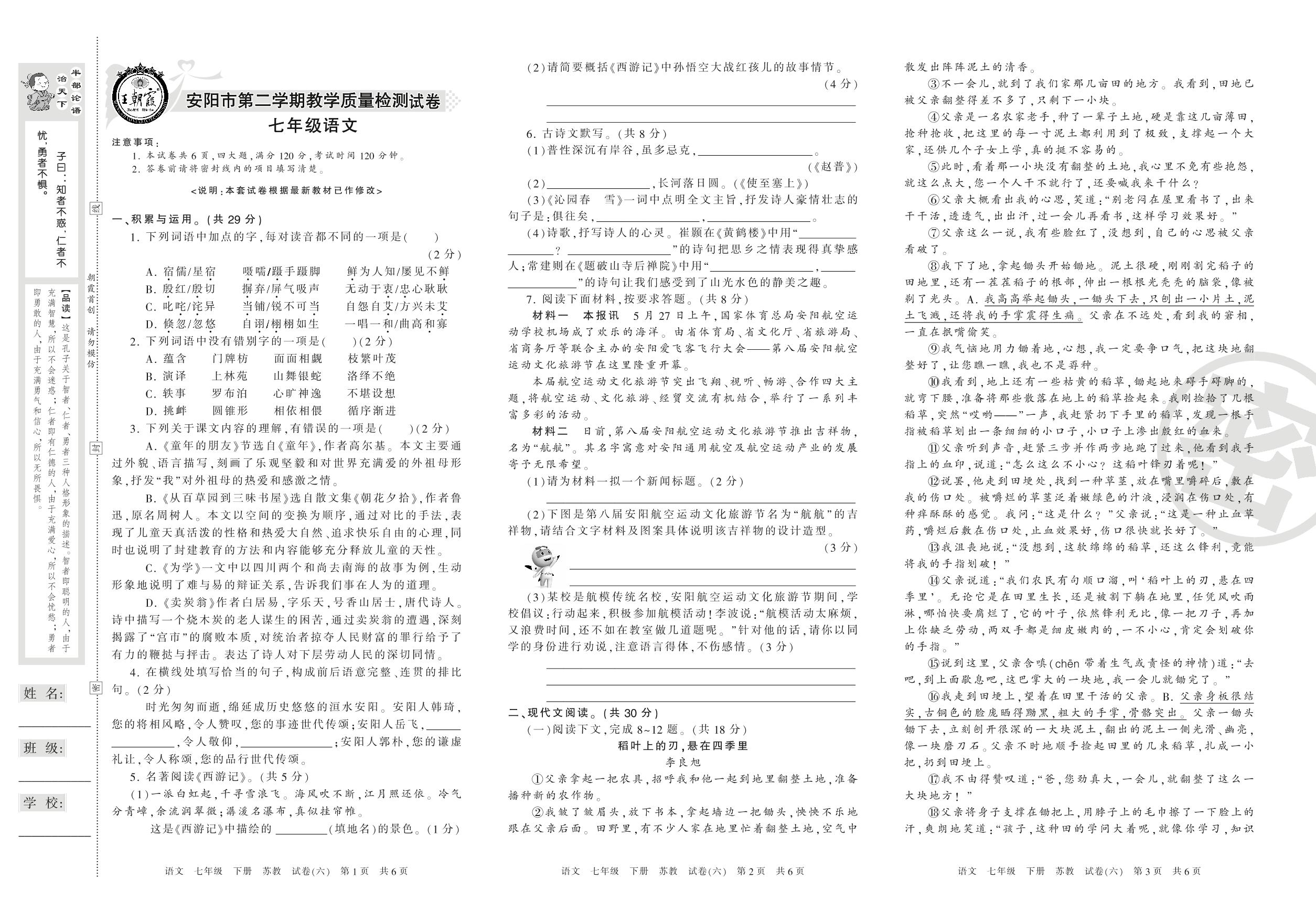 2015-2016学年第二学期安阳市七年级语文试卷(苏教版)【6】