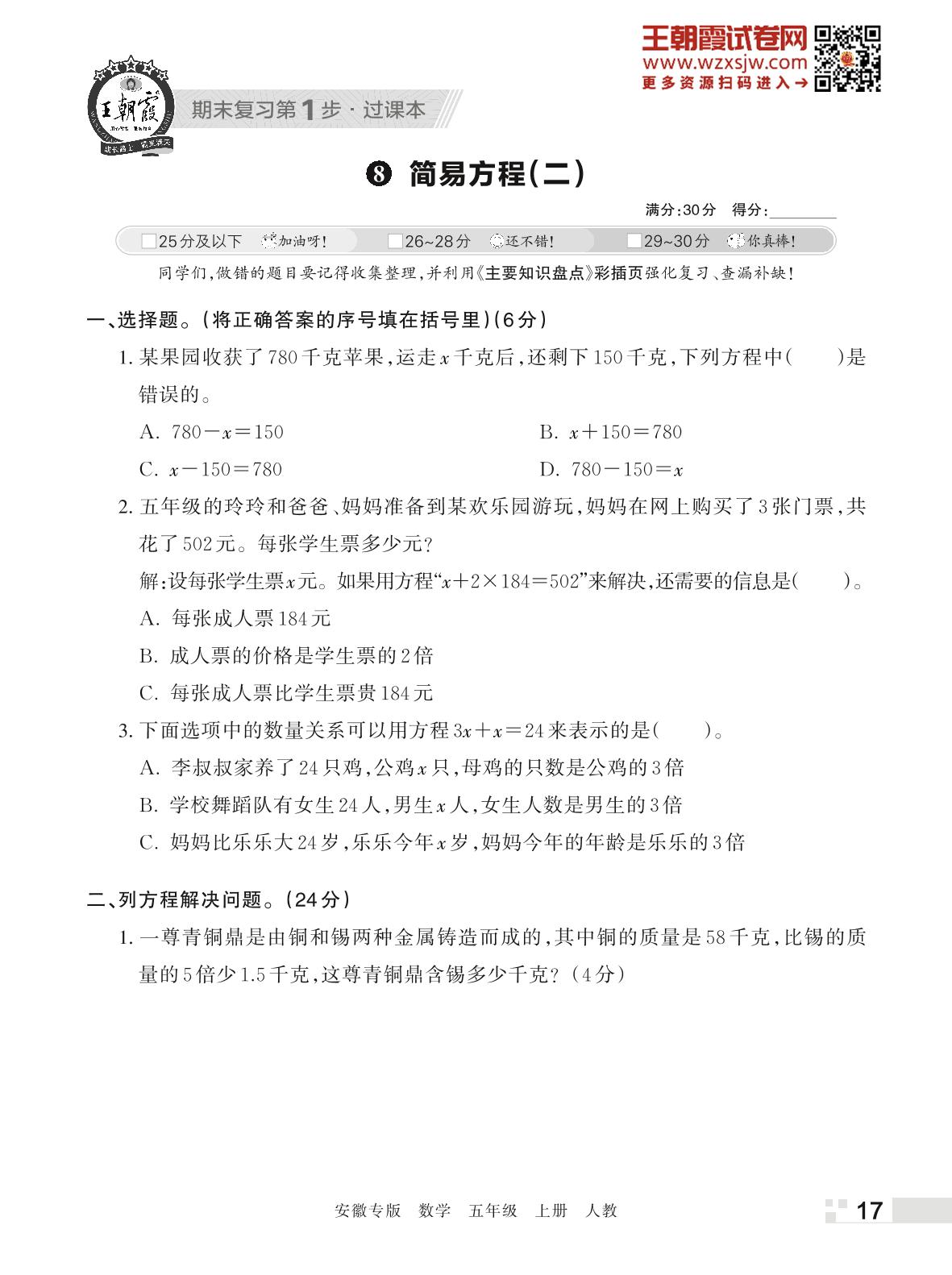 王朝霞期末过课本——8 简易方程(二)五年级上册数学(人教版)_R221127115336990