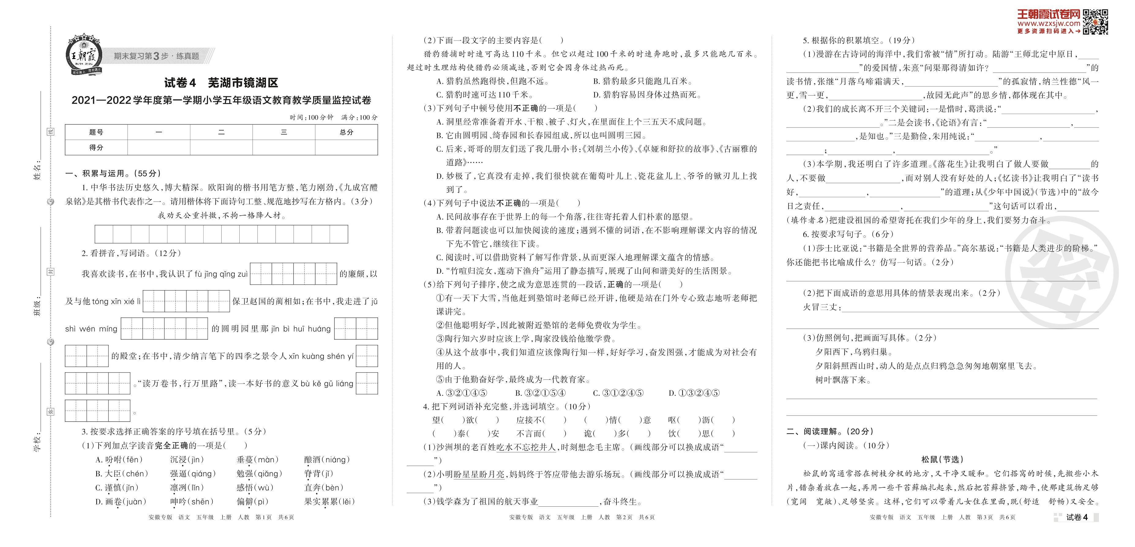 芜湖市镜湖区2021—2022学年度第一学期小学五年级语文教育教学质量监控试卷(人教版)【4】