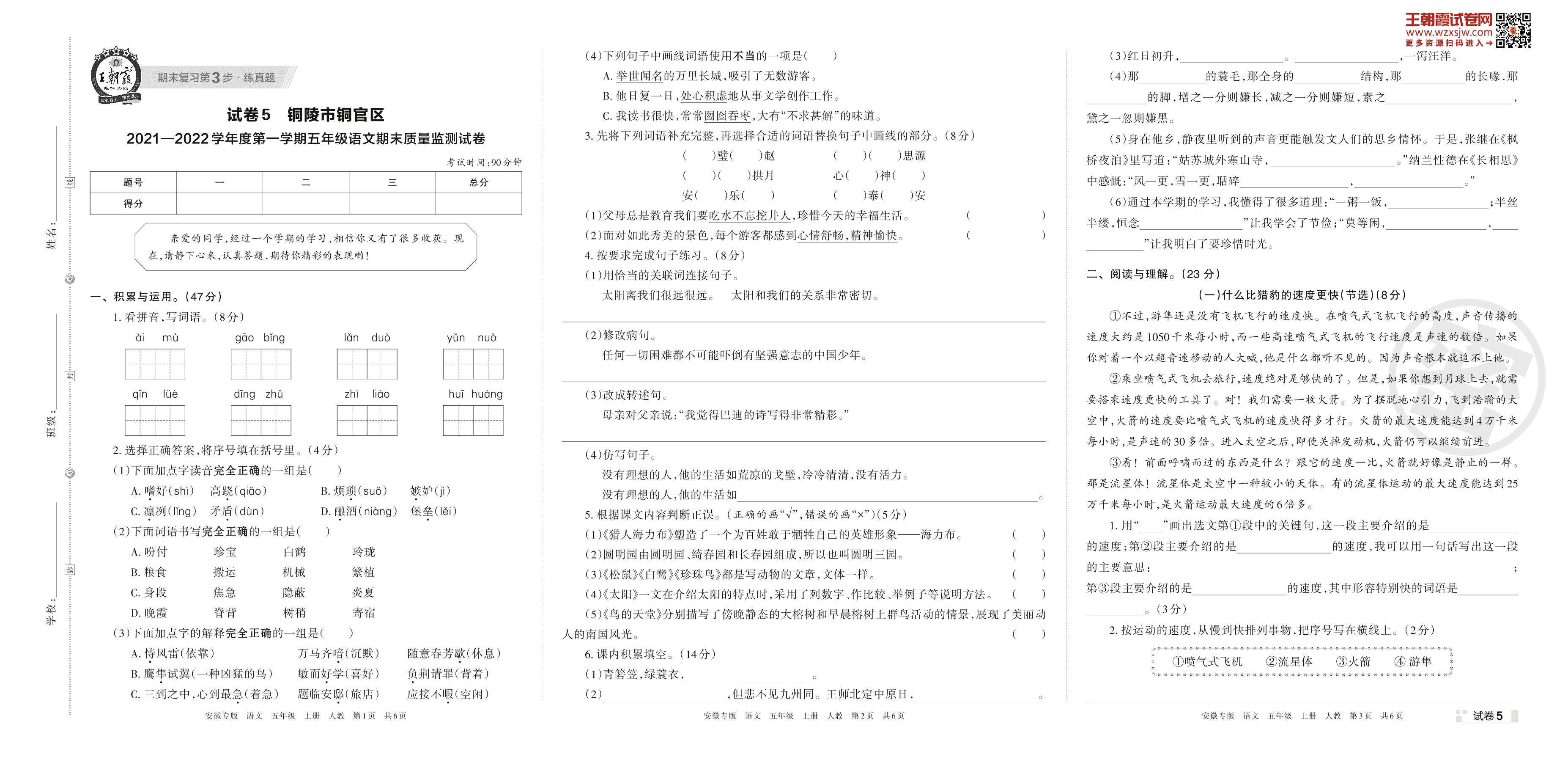 铜陵市铜官区2021—2022学年度第一学期五年级语文期末质量监测试卷(人教版)【5】