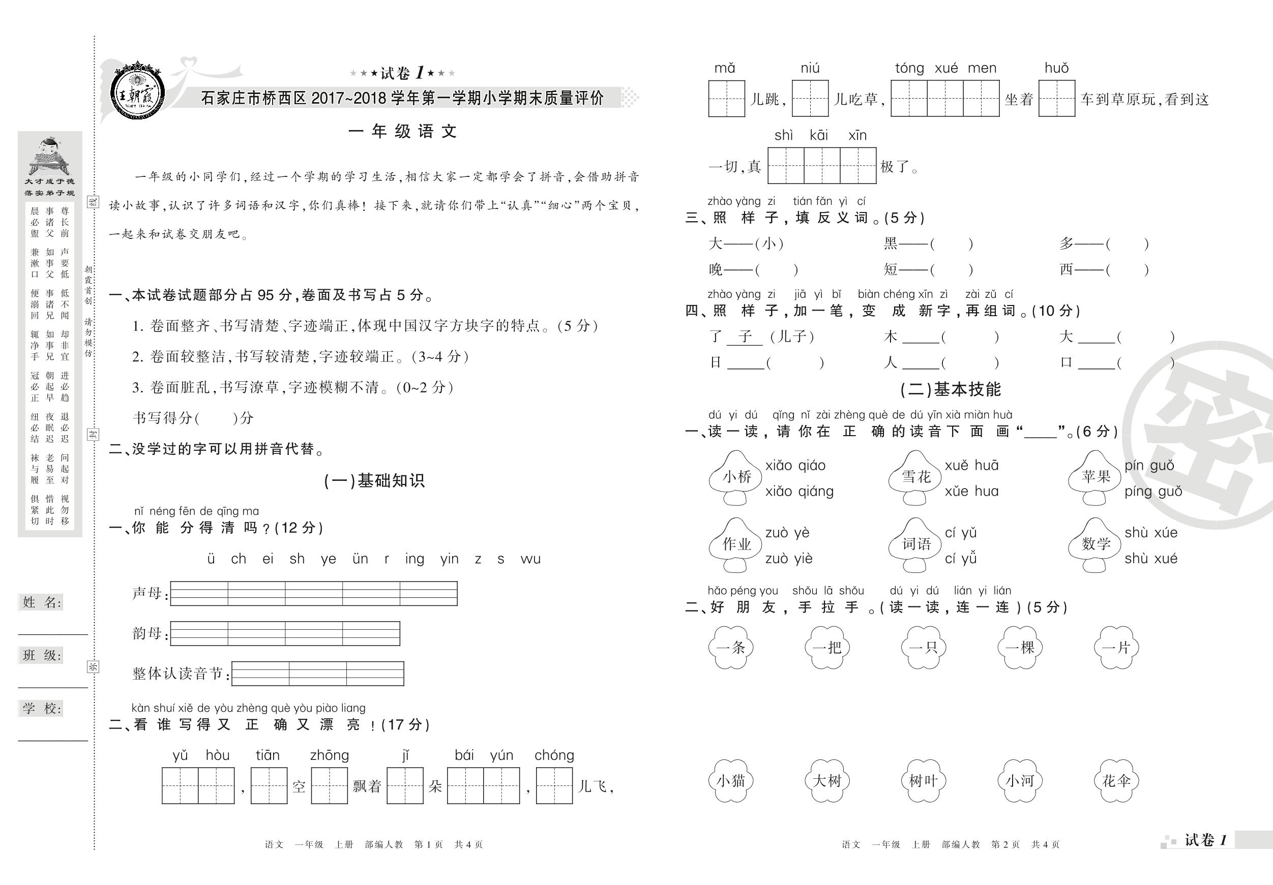 2017-2018学年第一学期石家庄市桥西区一年级语文试卷(人教版)【1】