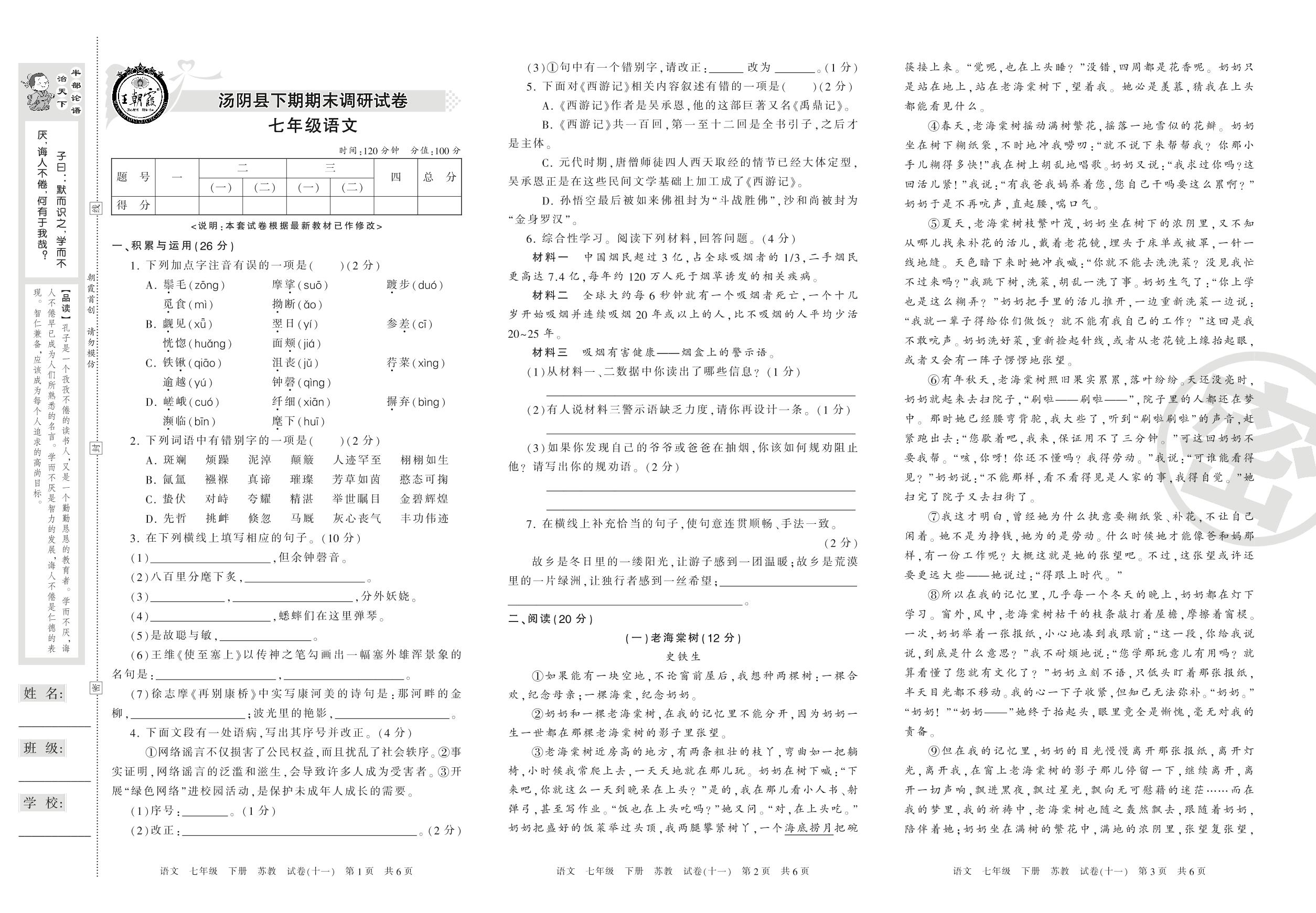 2015-2016学年第二学期安阳市汤阴县七年级语文试卷(苏教版)【11】