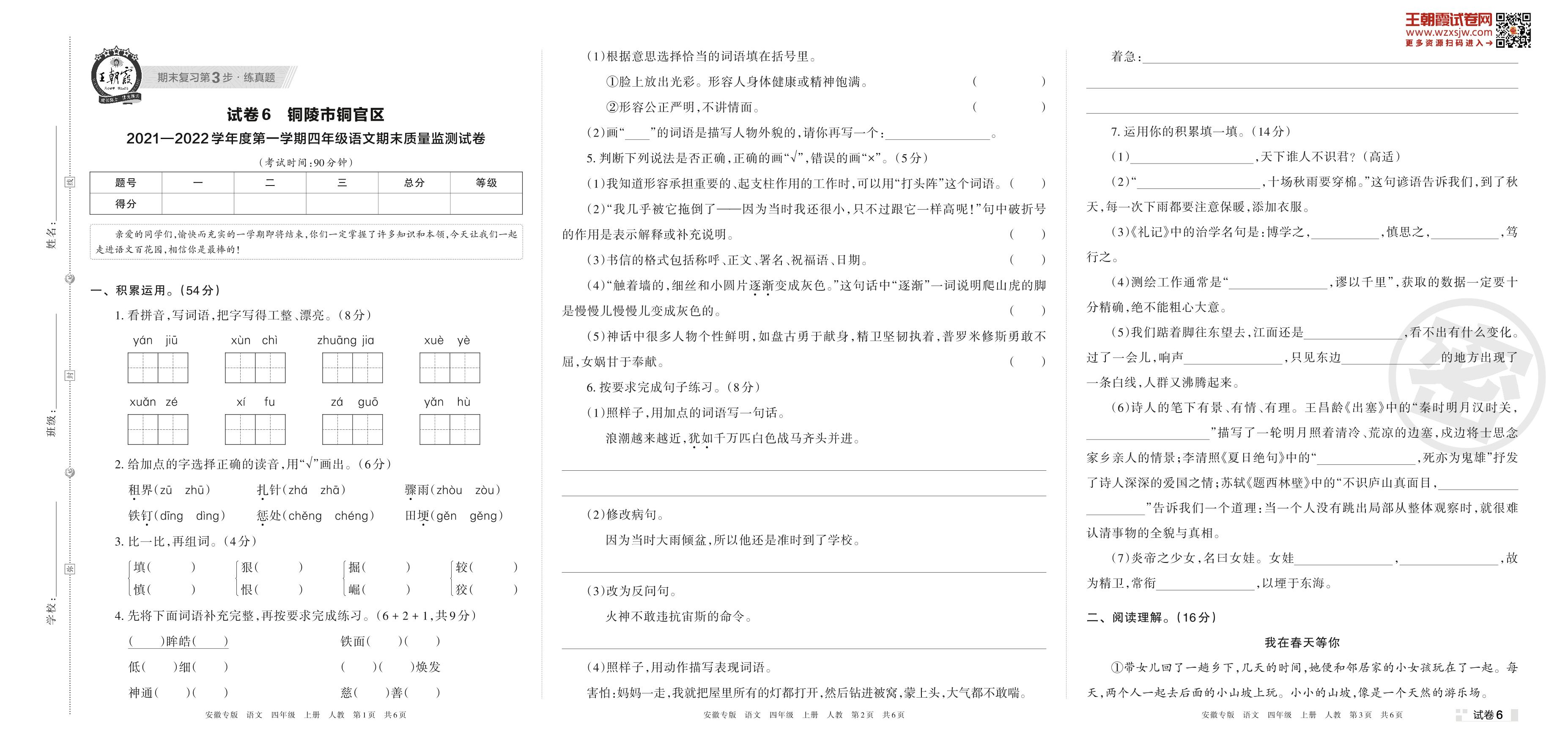 铜陵市铜官区2021—2022学年度第一学期四年级语文期末质量监测试卷(人教版)【6】
