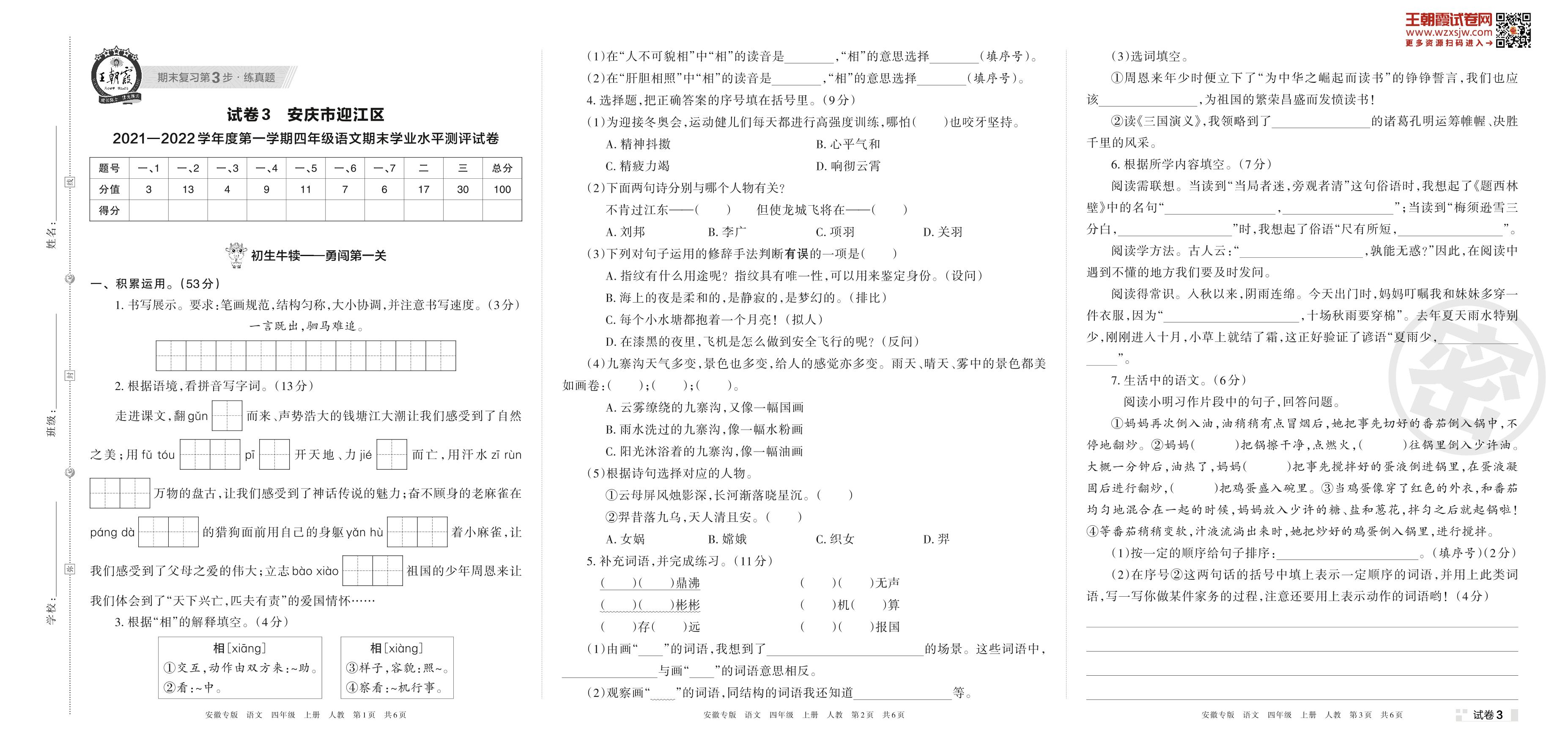 安庆市迎江区2021—2022学年度第一学期四年级语文期末学业水平测评试卷(人教版)【3】