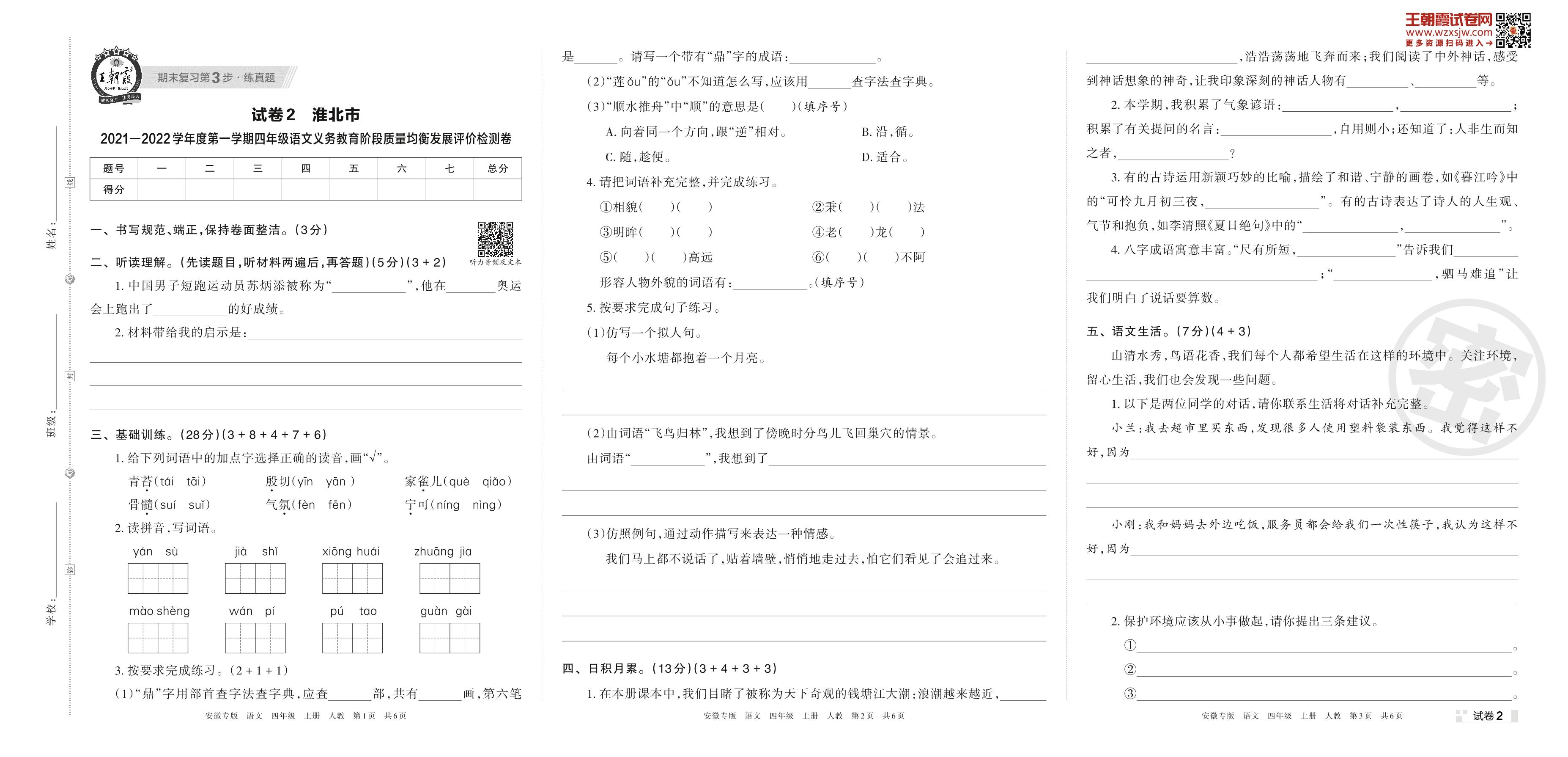 淮北市2021—2022学年度第一学期四年级语文义务教育阶段质量均衡发展评价检测卷(人教版)【2】