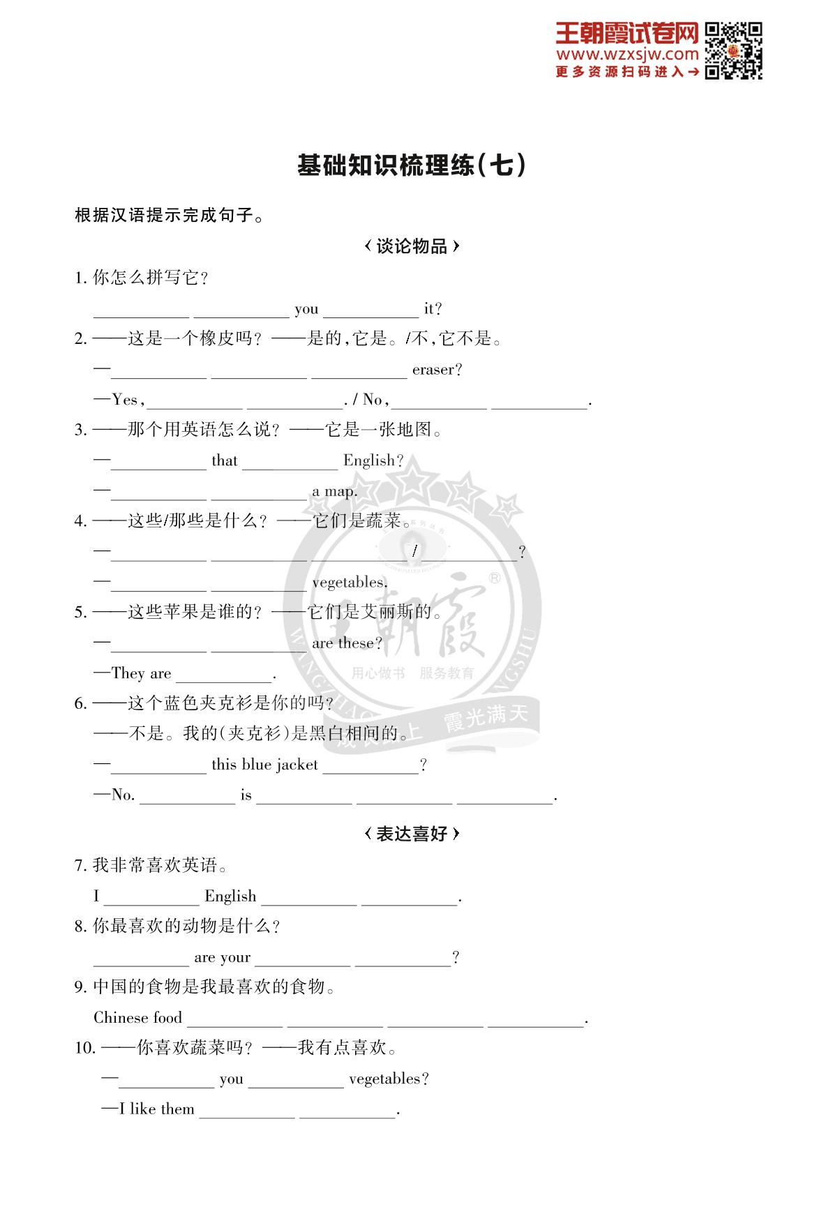 王朝霞期末过基础——基础知识梳理练(七)七年级上册英语(新课标版)