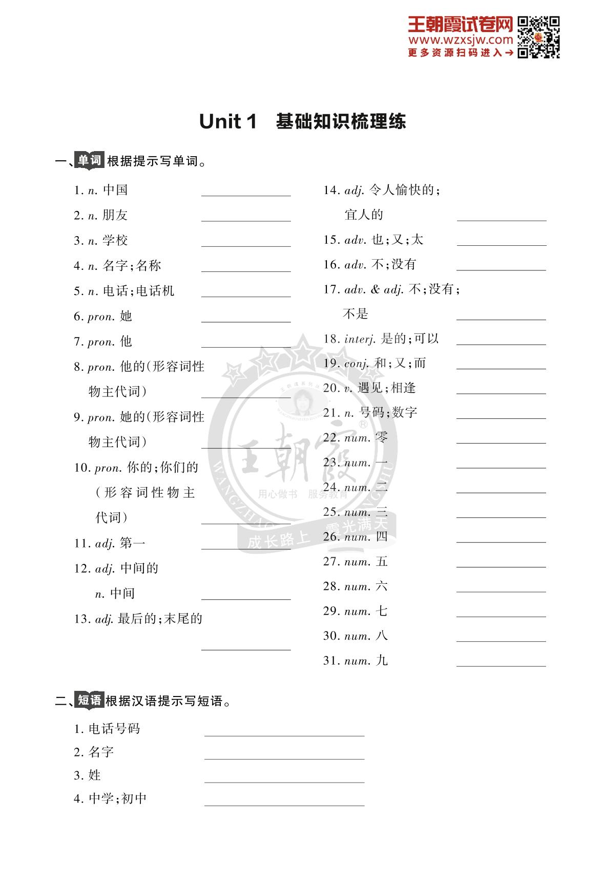 王朝霞期末过基础——Unit 1 基础知识梳理练七年级上册英语(人教版)