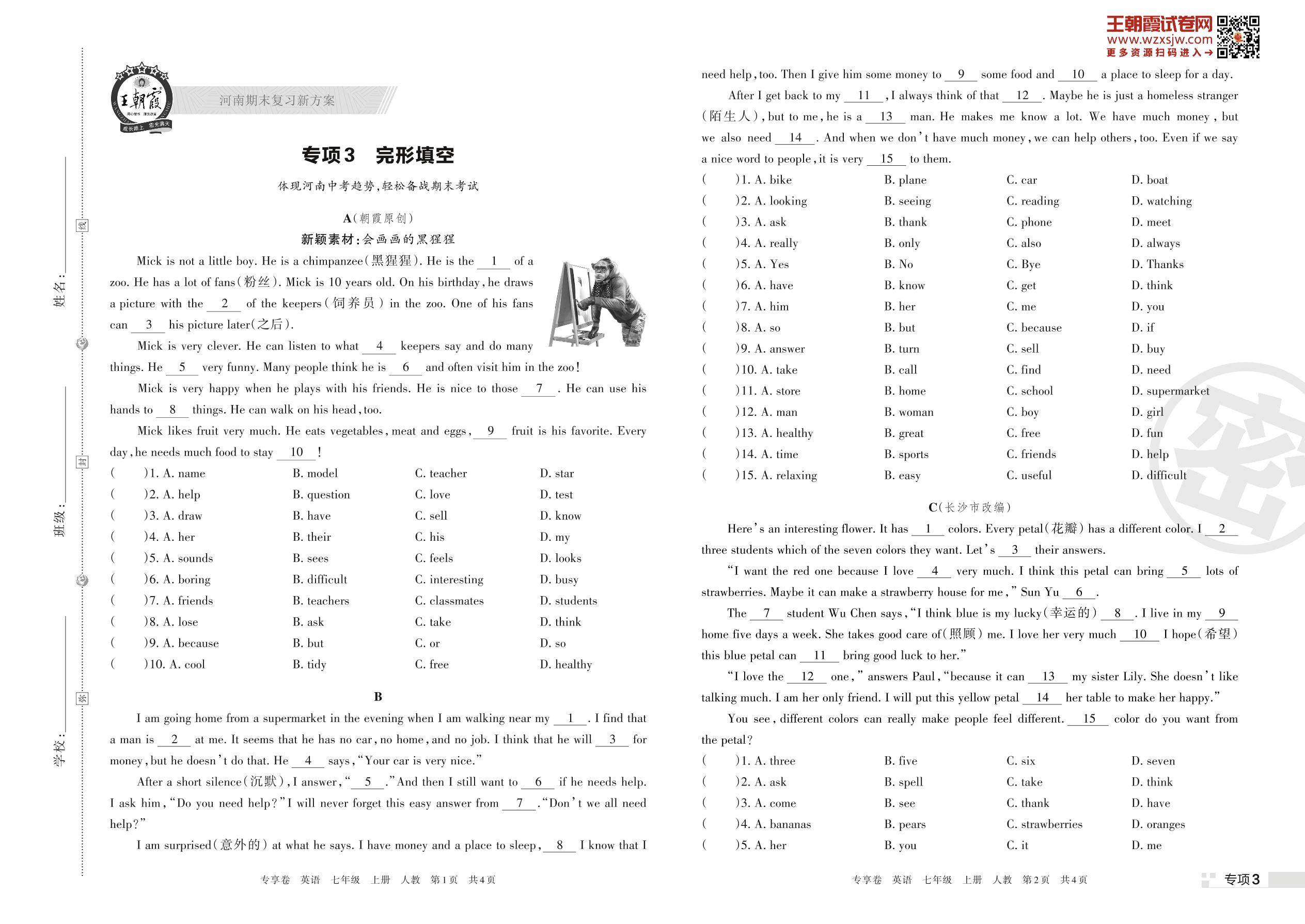 王朝霞期末专项卷——完形填空七年级上册英语(人教版)【3】