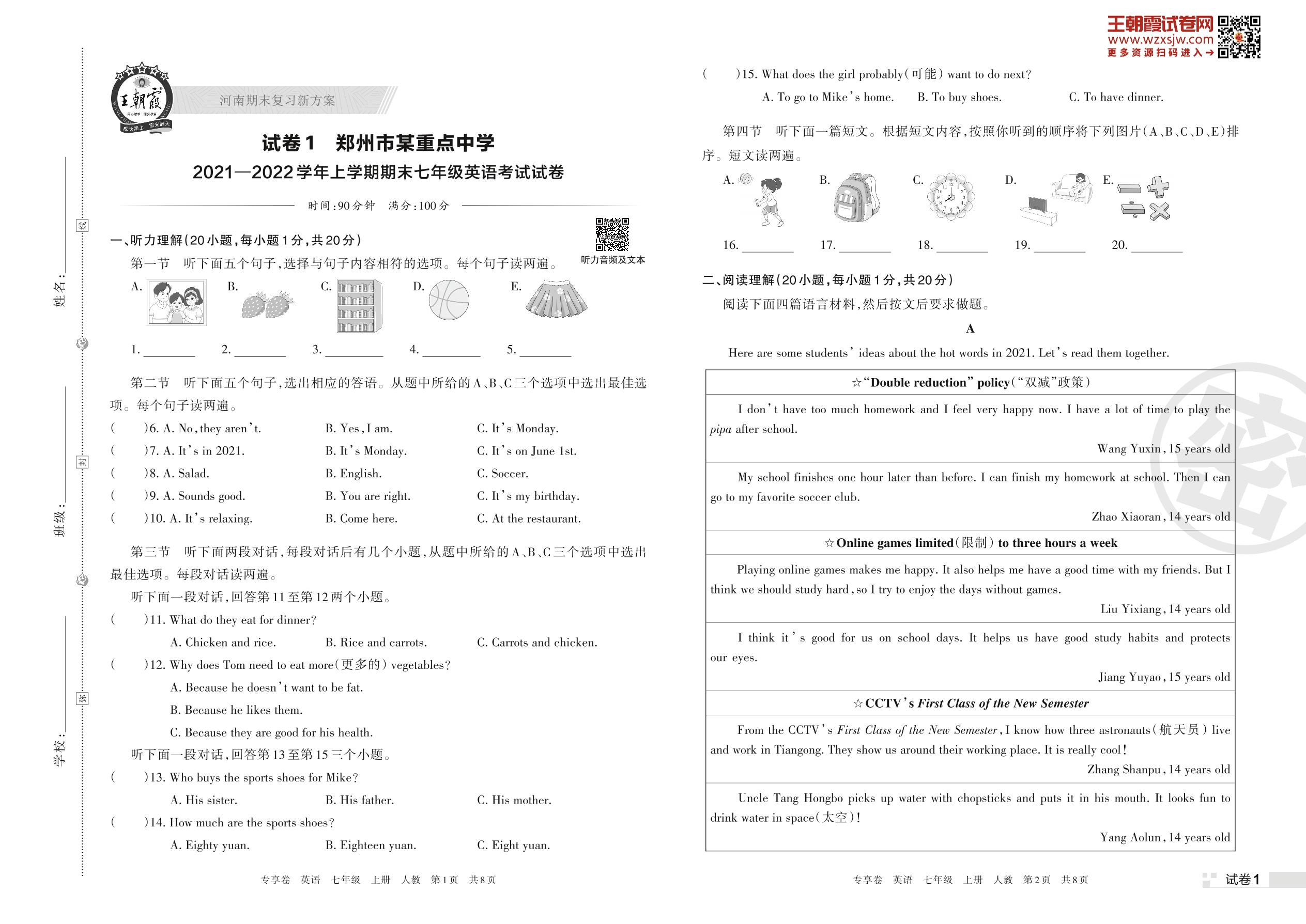 郑州市某重点中学2021—2022学年上学期期末七年级英语考试试卷(人教版)_R221127133336152【1】