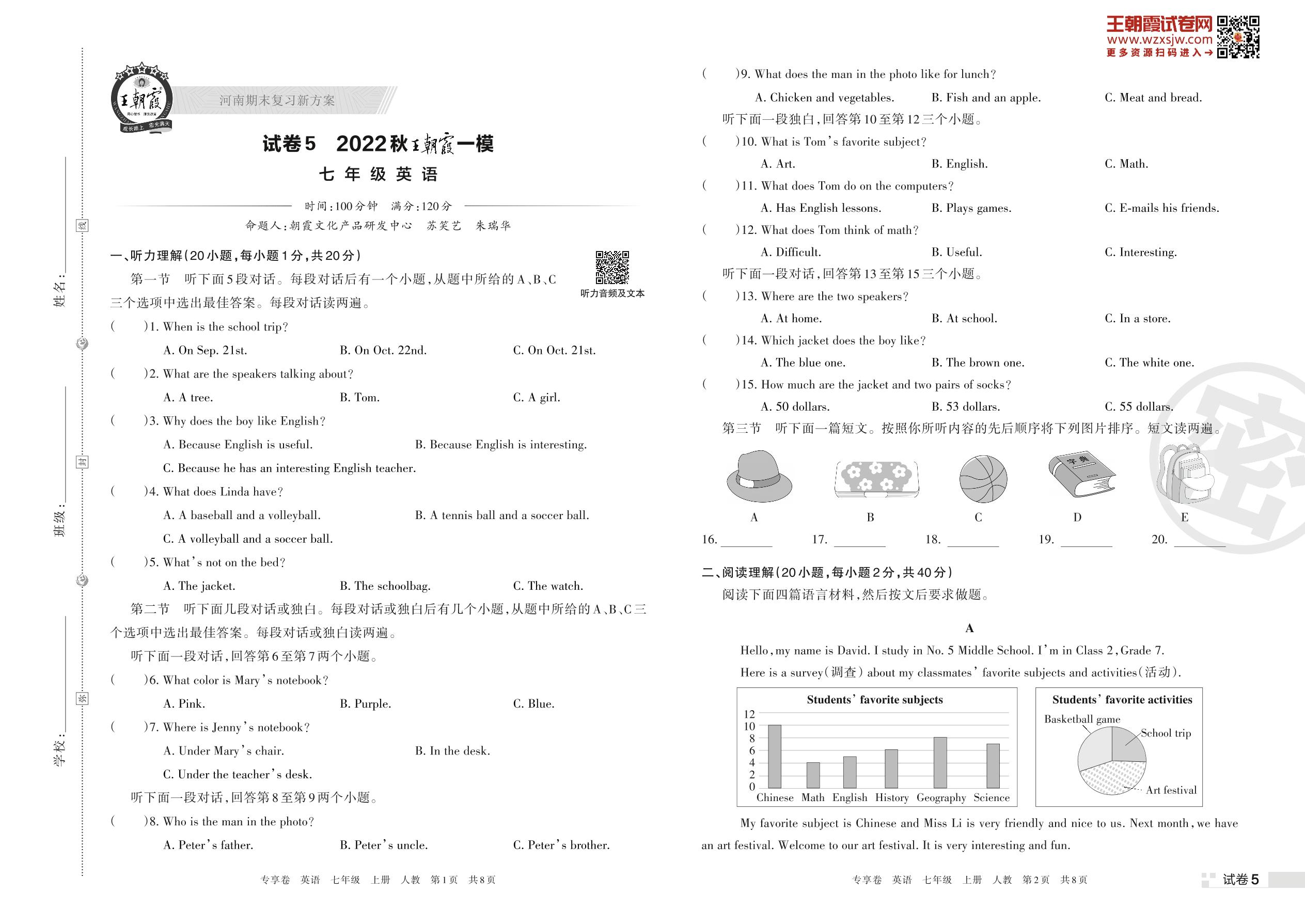王朝霞期末模拟卷七年级上册英语(人教版)【5】