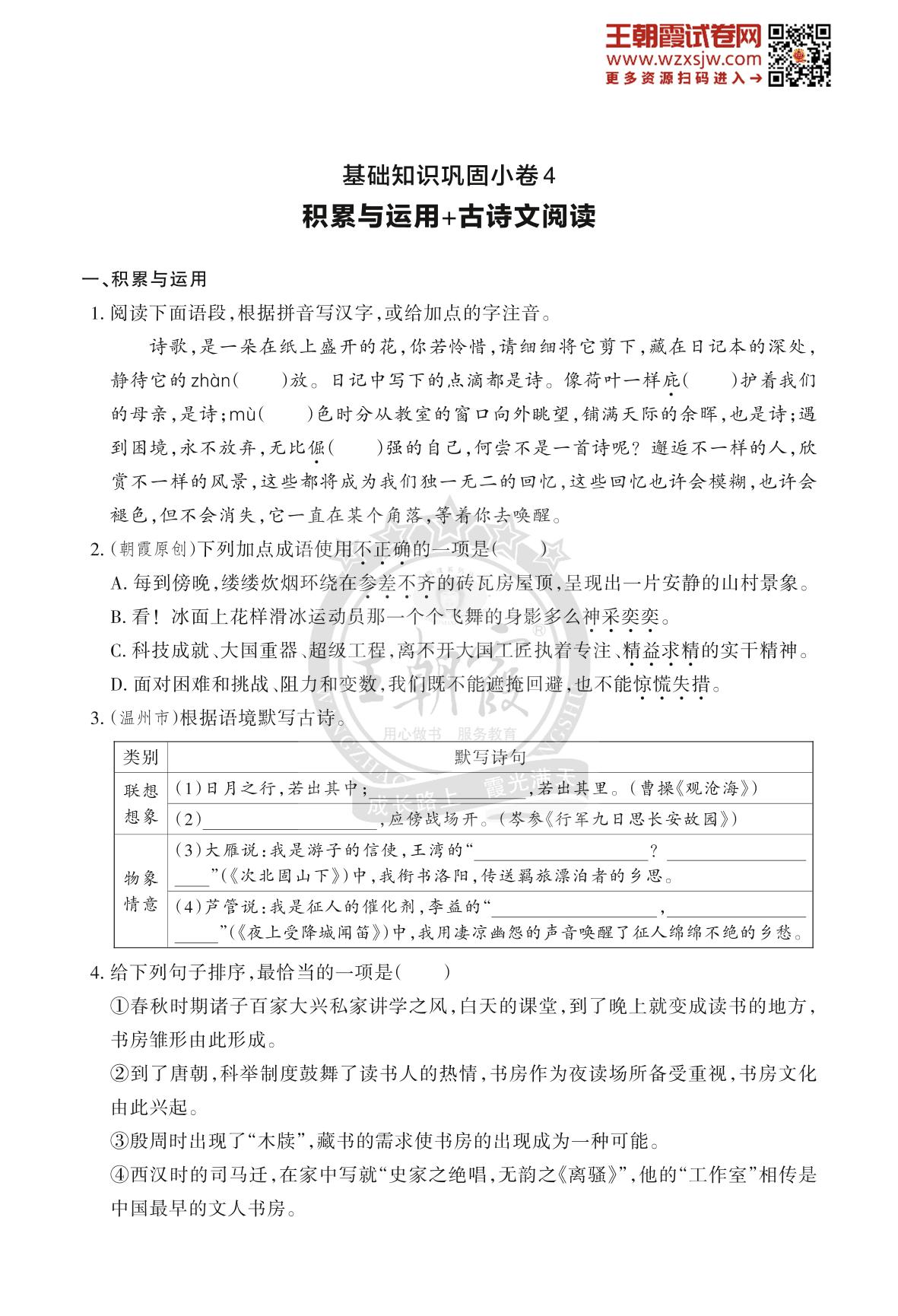 王朝霞期末过基础——基础知识巩固小卷4七年级上册语文(人教版)