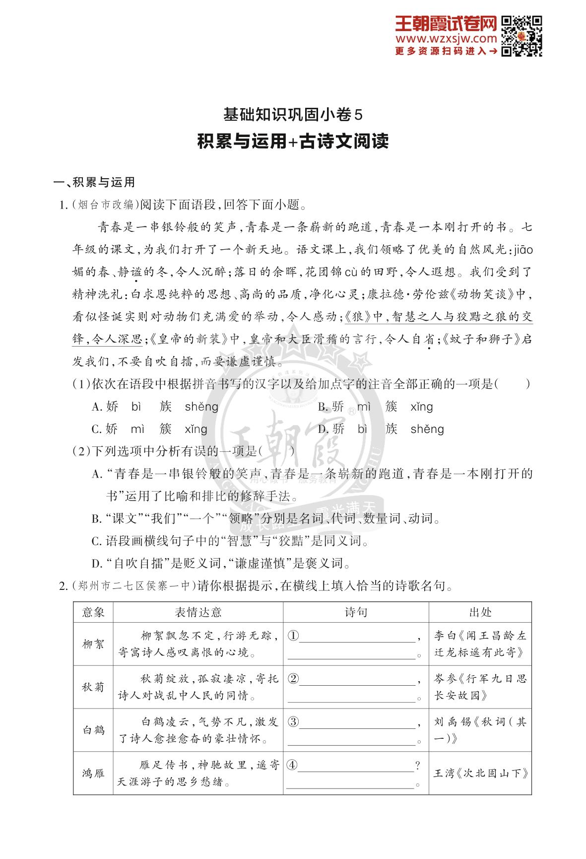 王朝霞期末过基础——基础知识巩固小卷5七年级上册语文(人教版)