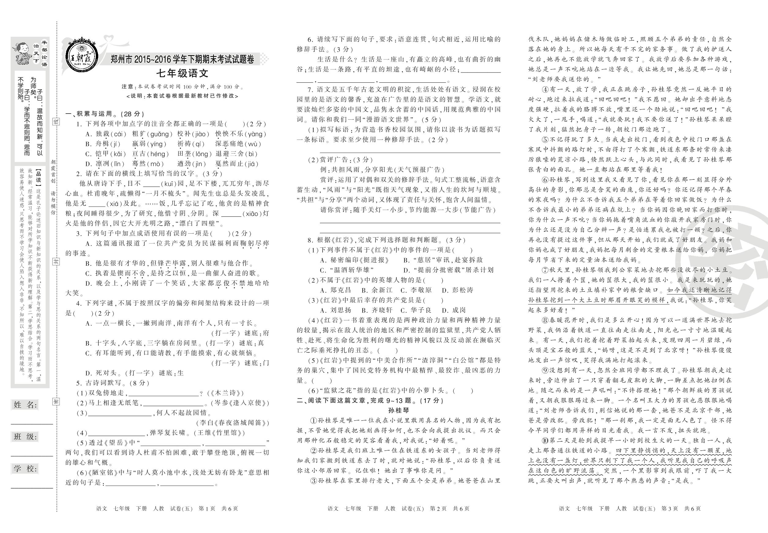 2015-2016学年第二学期郑州市七年级语文试卷(人教版)【5】