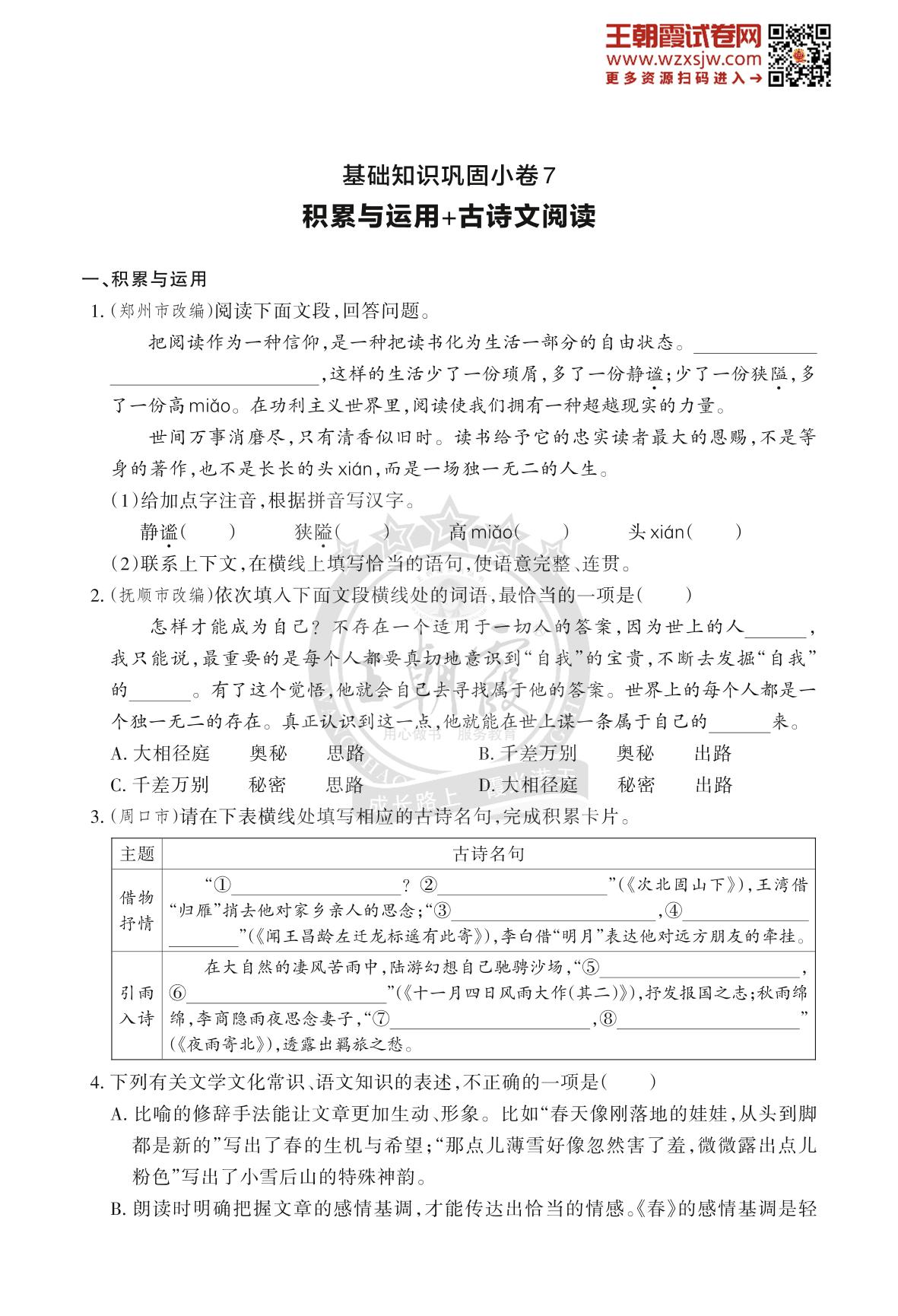 王朝霞期末过基础——基础知识巩固小卷7七年级上册语文(人教版)