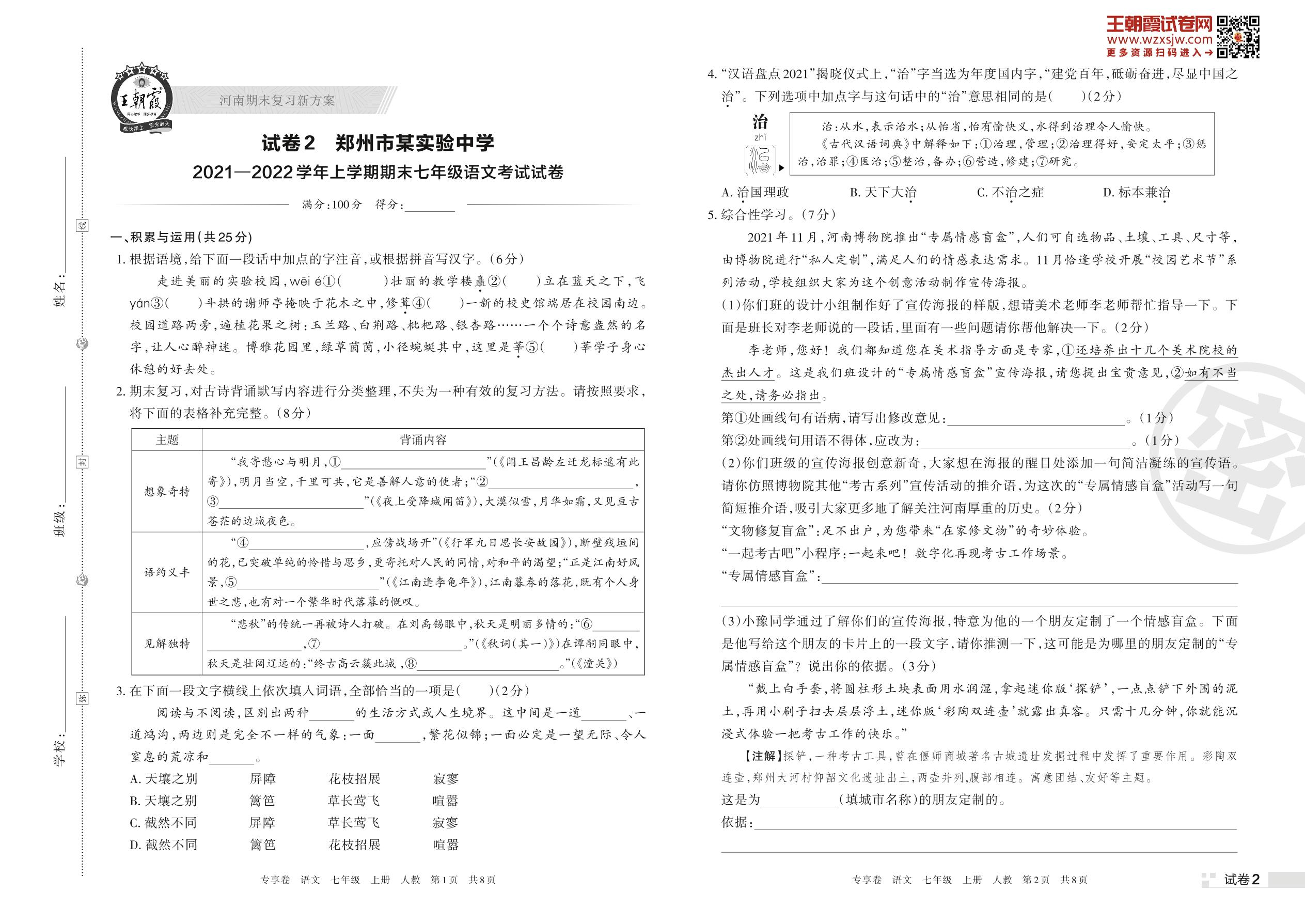 郑州市某实验中学2021—2022学年上学期期末七年级语文考试试卷(人教版)【2】
