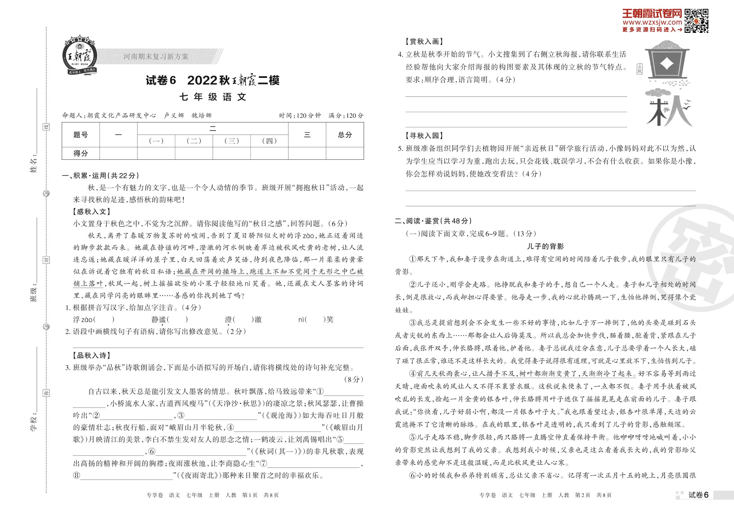 王朝霞期末模拟卷七年级上册语文(人教版)_R221127140236916【6】