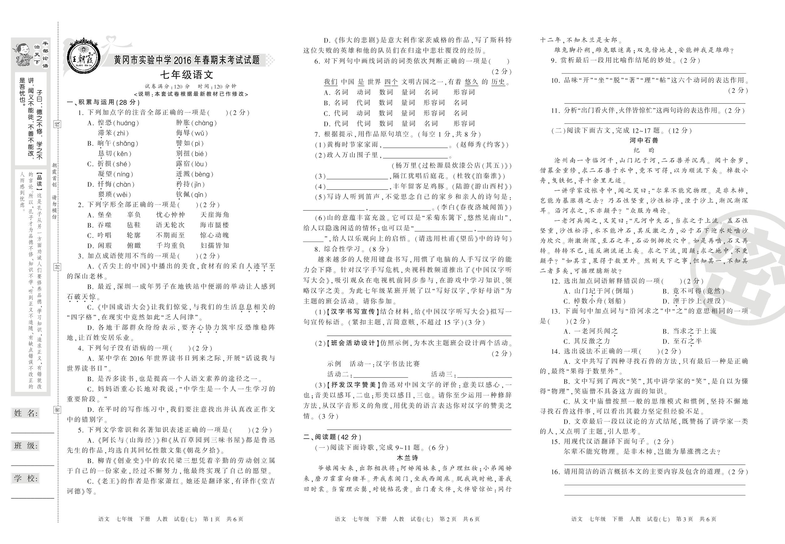 2015-2016学年第二学期黄冈市实验中学七年级语文试卷(人教版)【7】