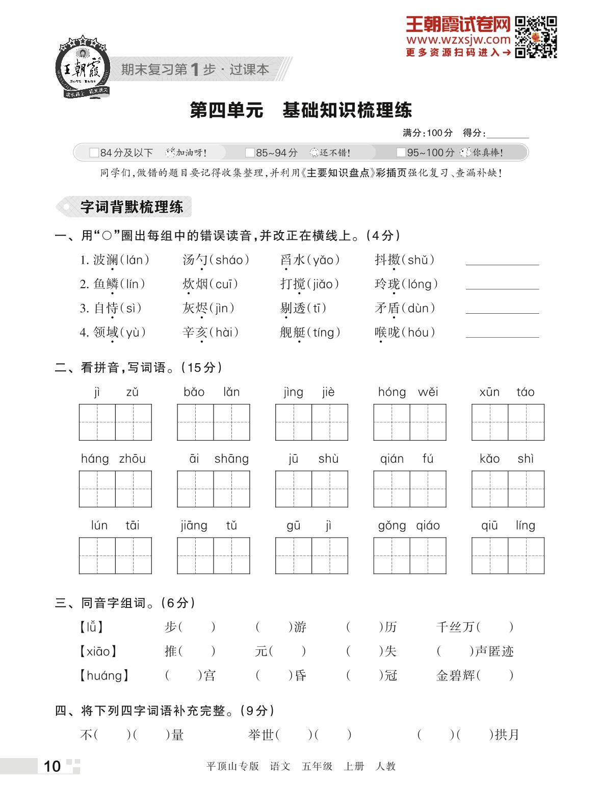 王朝霞期末过课本——第四单元 基础知识梳理练五年级上册语文(人教版)_R221127175315553