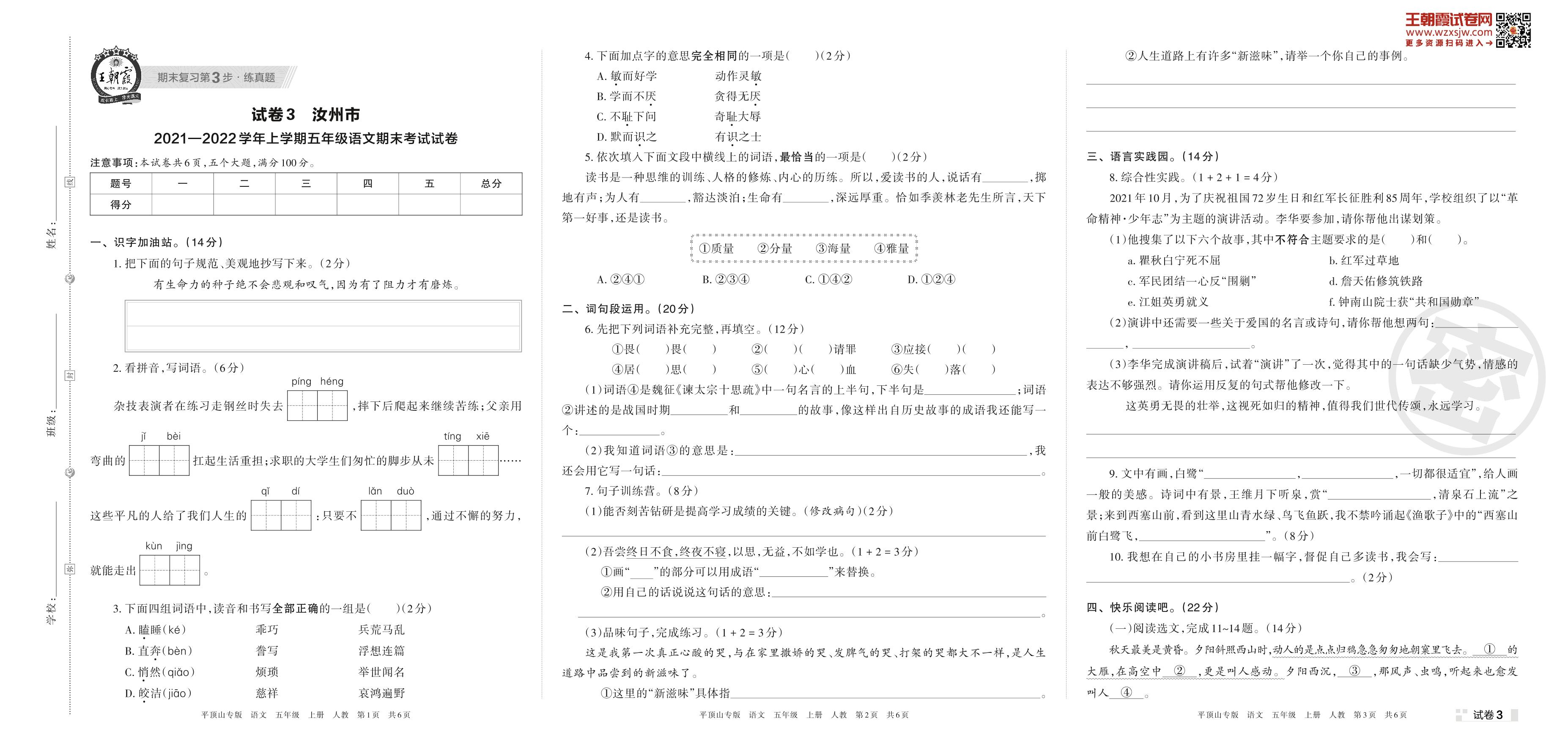 汝州市2021—2022学年上学期五年级语文期末考试试卷(人教版)【3】