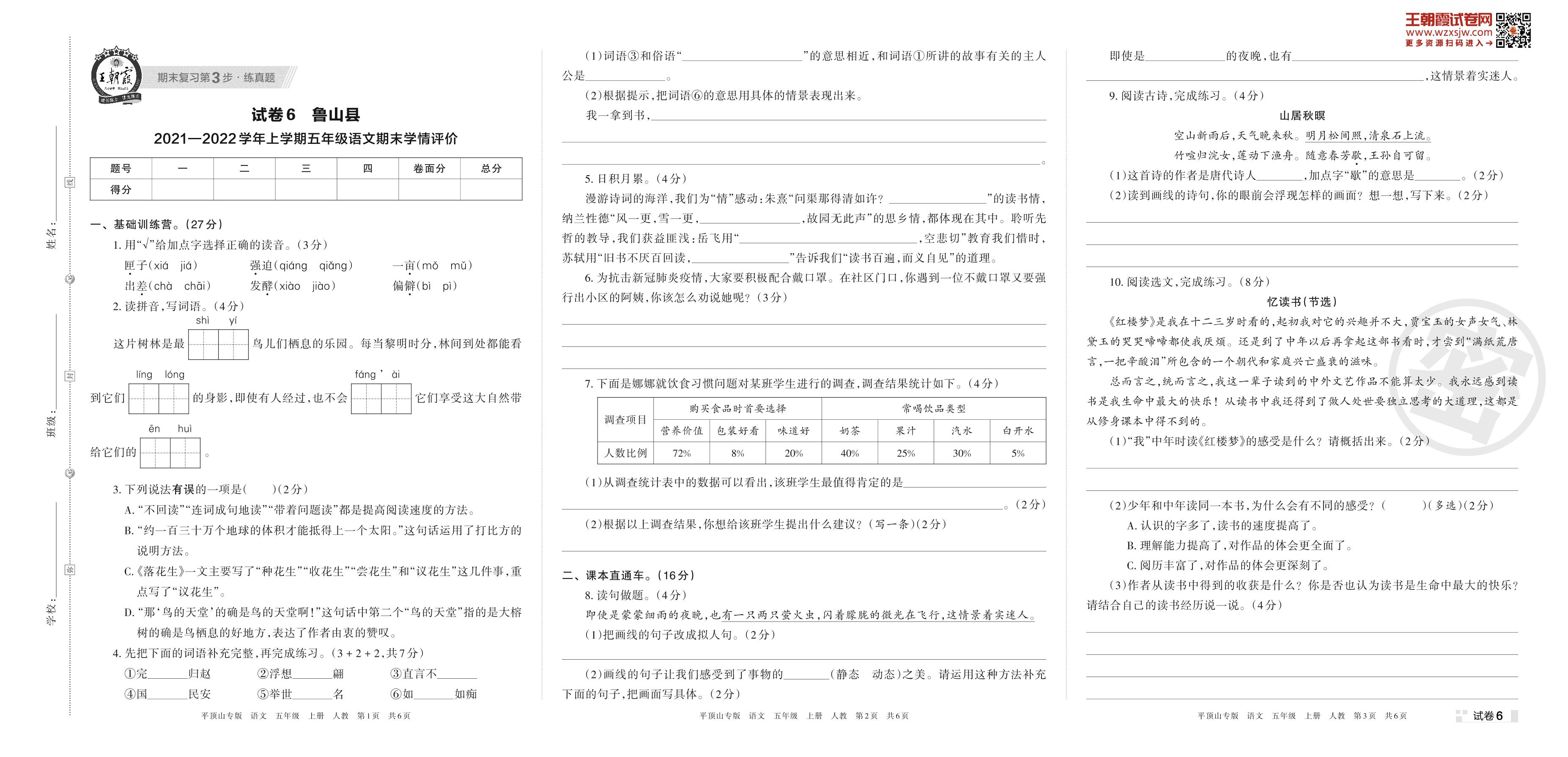 鲁山县2021—2022学年上学期五年级语文期末学情评价(人教版)【6】