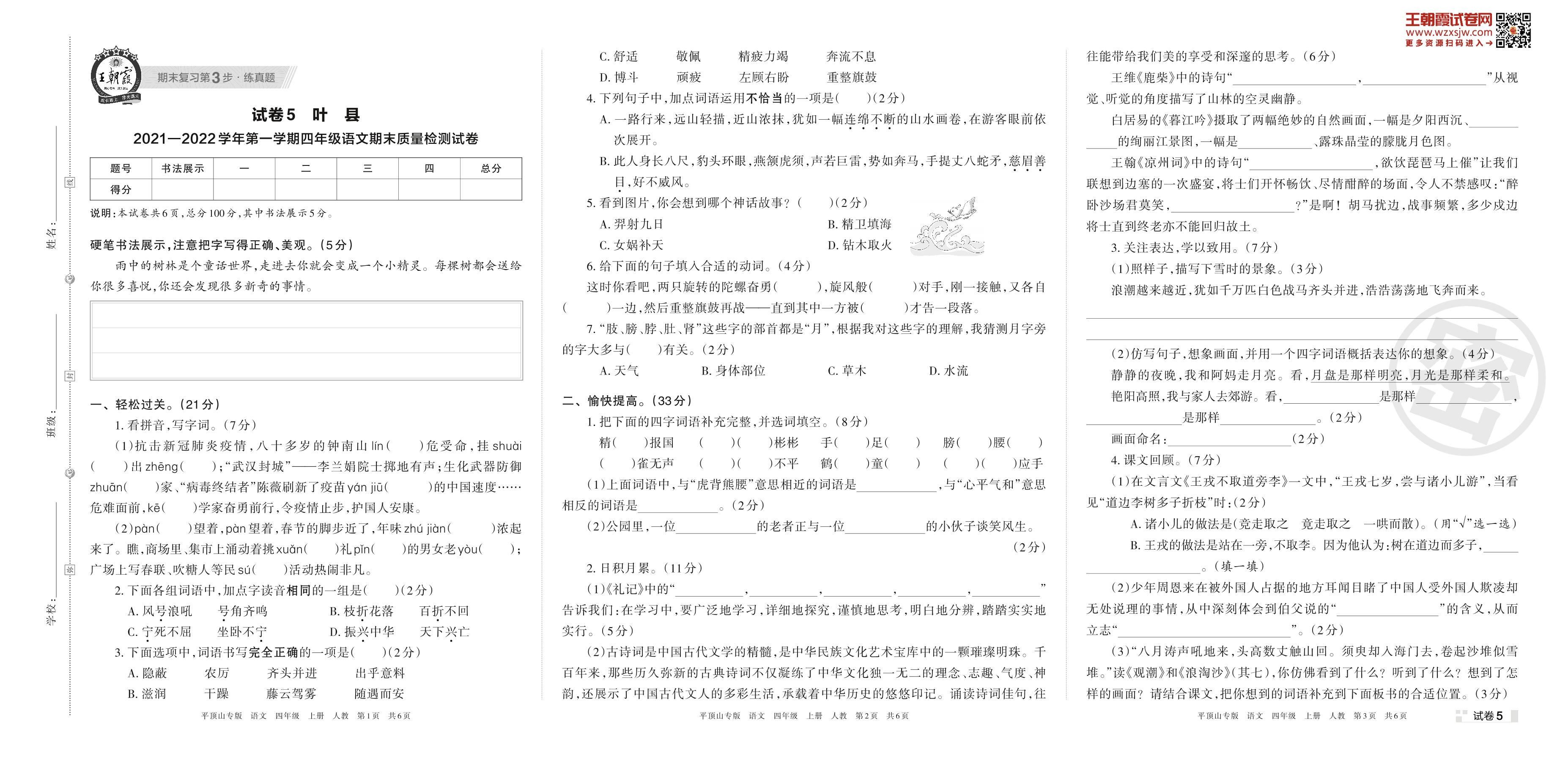 叶县2021—2022学年第一学期四年级语文期末质量检测试卷(人教版)【5】