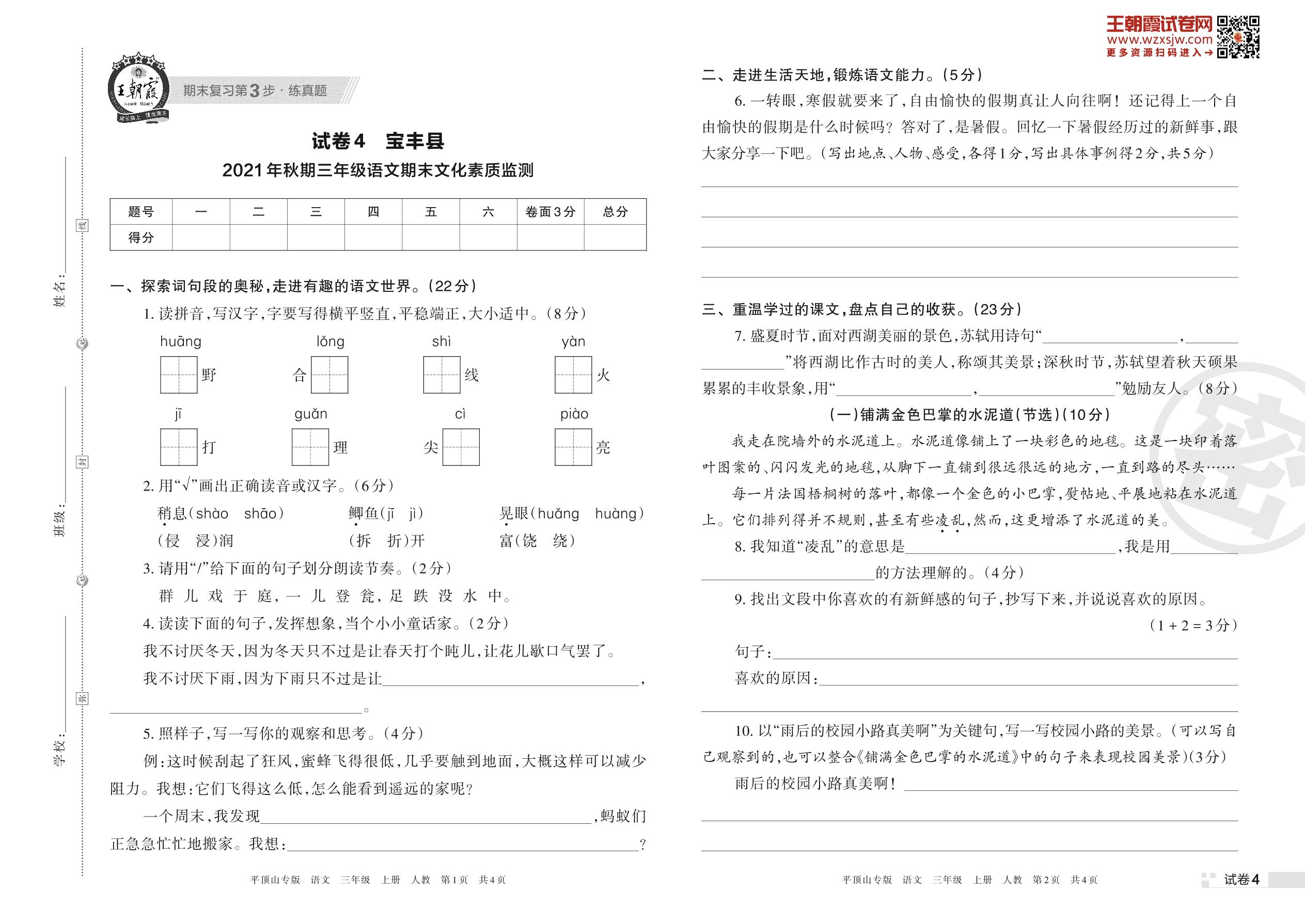 宝丰县2021年秋期三年级语文期末文化素质监测(人教版)【4】