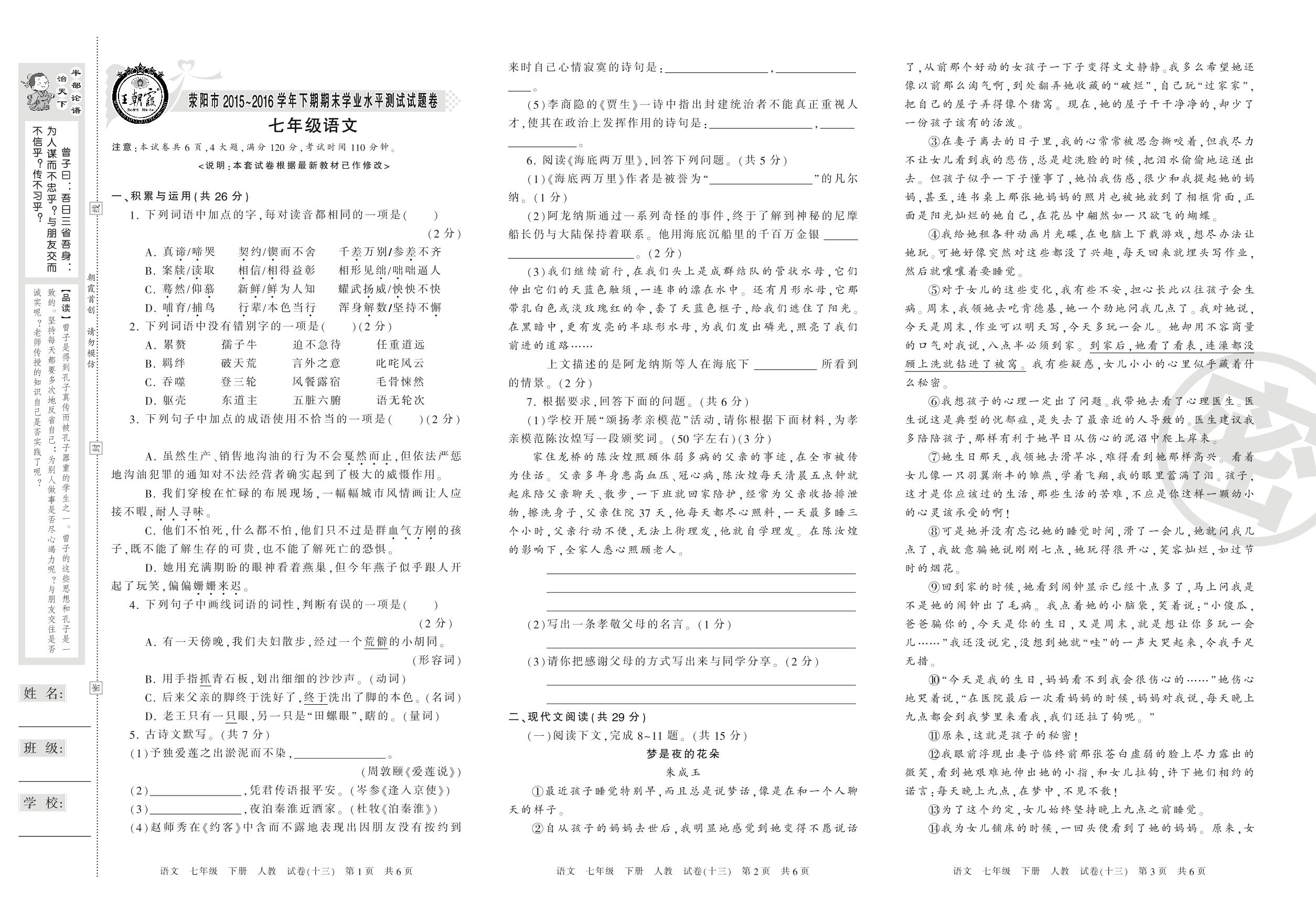 2015-2016学年第二学期荥阳市七年级语文试卷(人教版)【13】