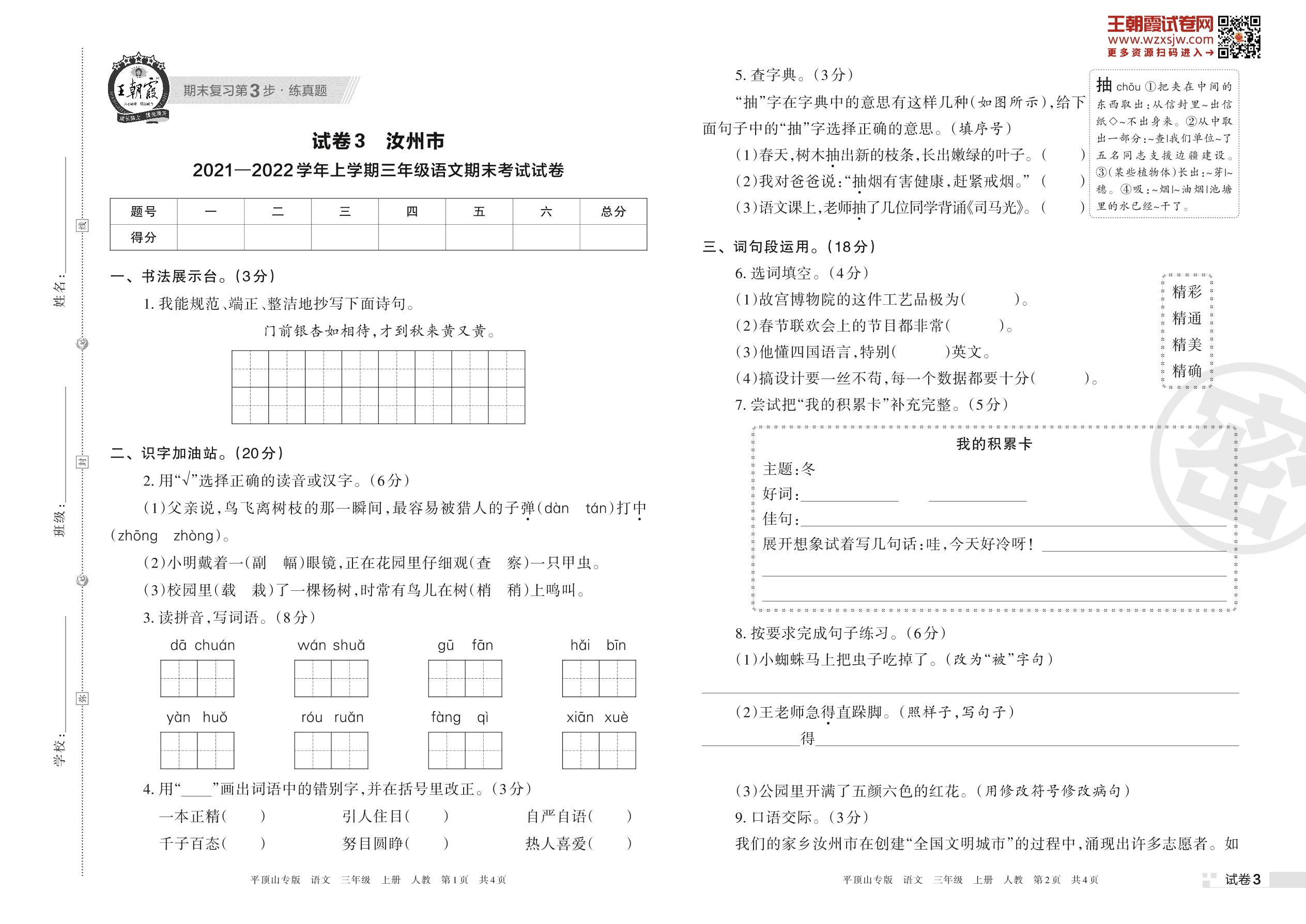 汝州市2021—2022学年上学期三年级语文期末考试试卷(人教版)【3】